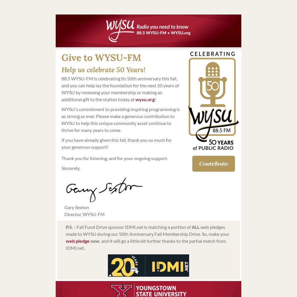 88.5 WYSU-FM is celebrating its 50th anniversary this fall, and you can help lay the foundation for the next 50 years of WYSU by renewing your membership or making an additional gift to the station today at