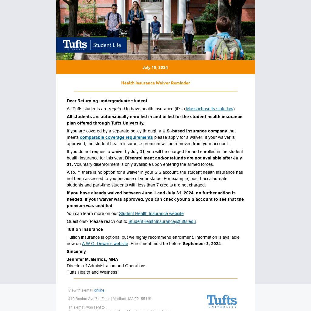 All students are automatically enrolled in and billed for the student health insurance plan offered through Tufts University.