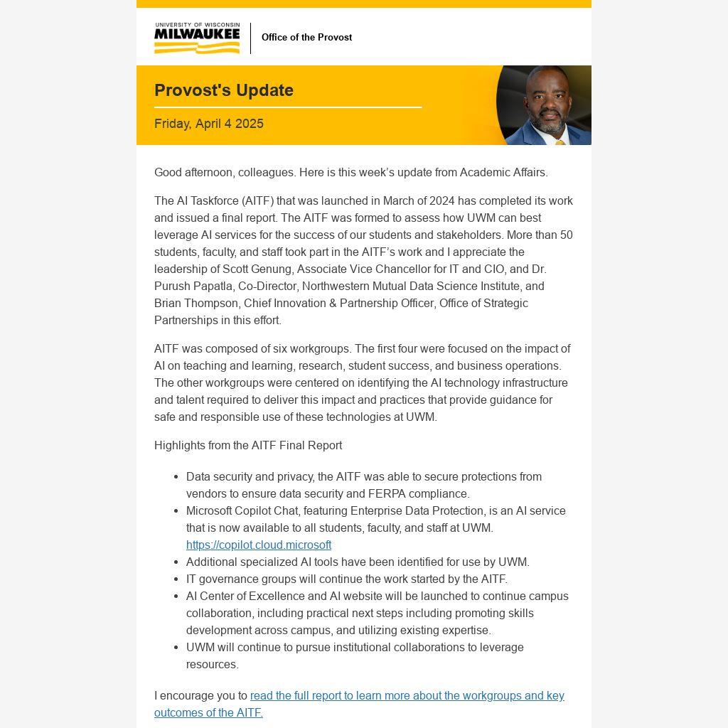 The AI Taskforce (AITF) that was launched in March of 2024 has completed its work and issued a final report. The AITF was formed to assess how UWM can best leverage AI services for the success of our students and stakeholders. More than 50 students, faculty, and staff took part in the AITF’s work and I appreciate the leadership of Scott Genung, Associate Vice Chancellor for IT and CIO, and Dr. Purush Papatla, Co-Director, Northwestern Mutual Data Science Institute, and Brian Thompson, Chief Innovation & Partnership Officer, Office of Strategic Partnerships in this effort.