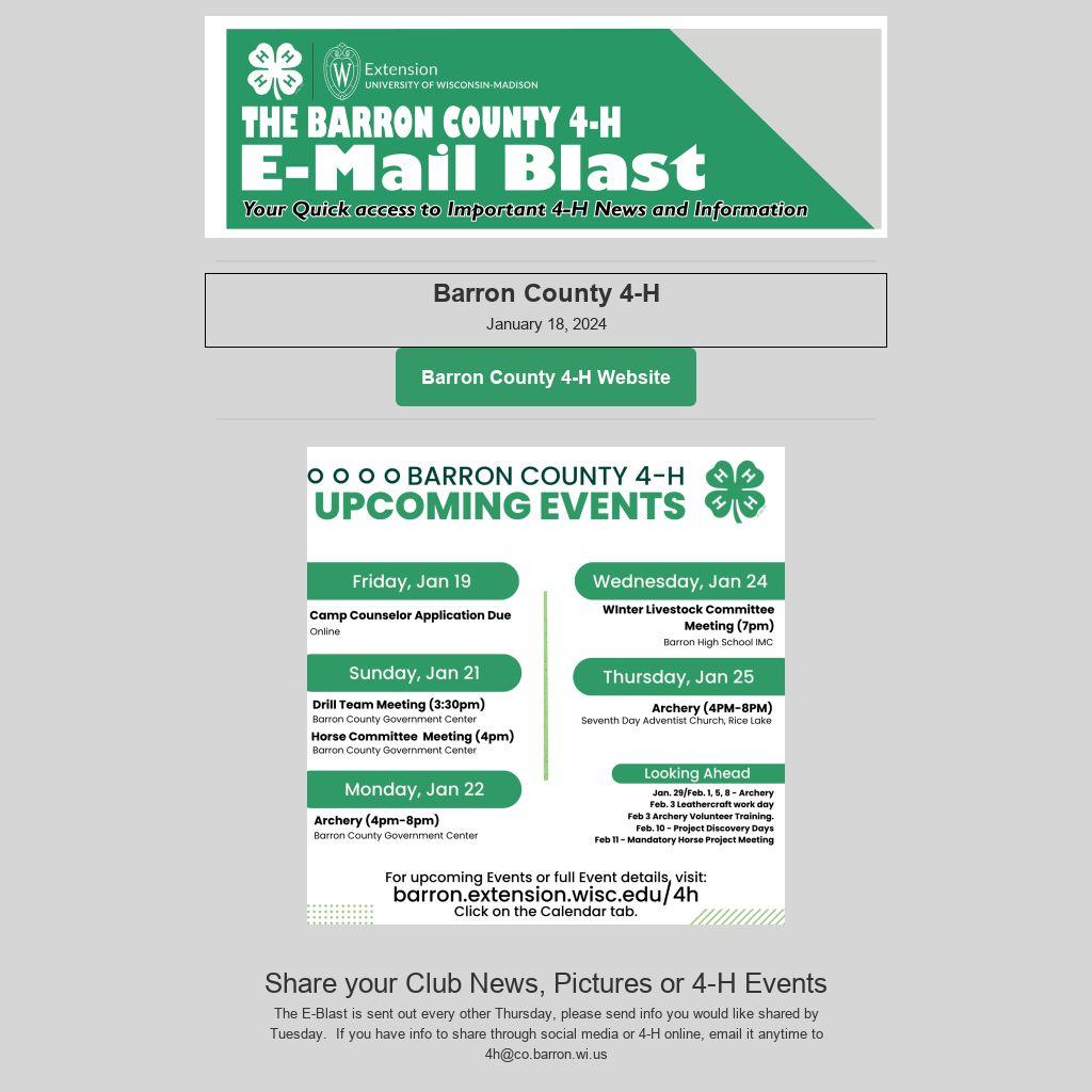 The E-Blast is sent out every other Thursday, please send info you would like shared by Tuesday. If you have info to share through social media or 4-H online, email it anytime to 4h@co.barron.wi.us