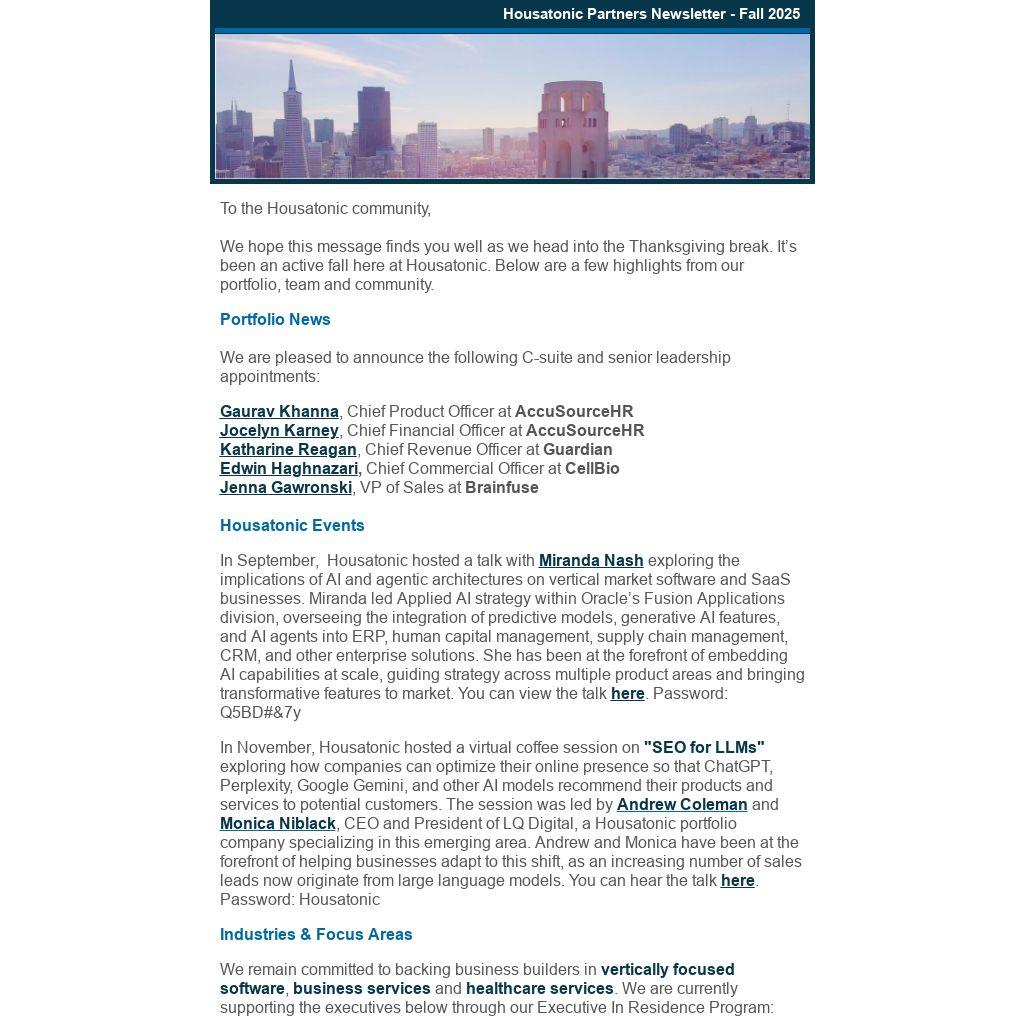 We hope this message finds you well as we head into the Thanksgiving break. It’s been an active fall here at Housatonic. Below are a few highlights from our portfolio, team and community.