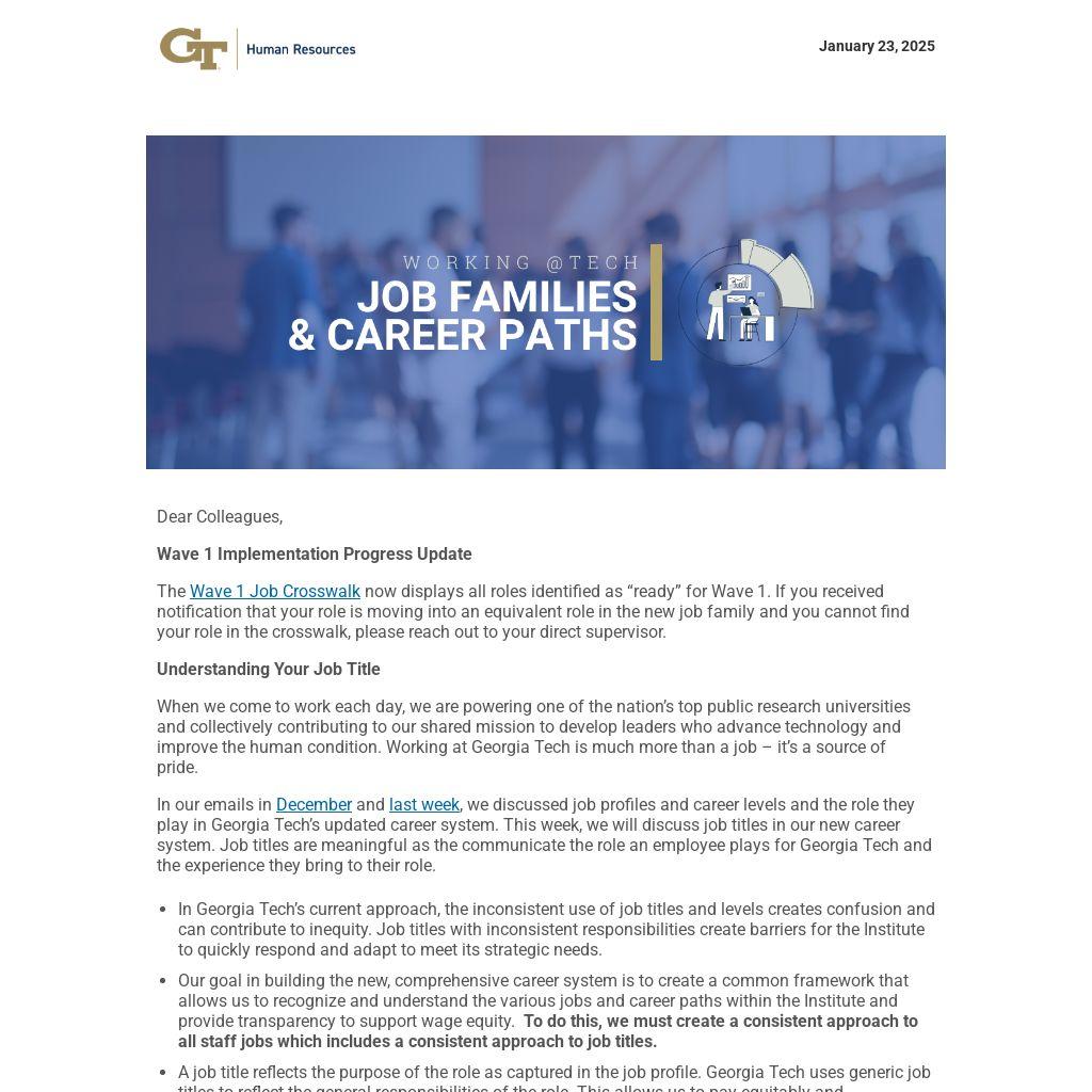 In our emails in December and last week, we discussed job profiles and career levels and the role they play in Georgia Tech’s updated career system. This week, we will discuss job titles in our new career system. Job titles are meaningful as the communicate the role an employee plays for Georgia Tech and the experience they bring to their role.