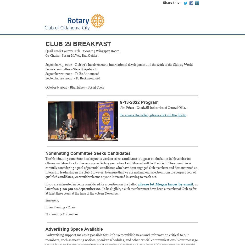 Advertising support makes it possible for Club 29 to publish news and information critical to our members, such as meeting notices, speaker schedules, and other crucial communications. Your message would be seen by our community's most prominent leaders and gain incredible exposure on the world wide web. The advertising revenue pays for the software we use to design and distribute the newsletters as well as Club 29's website hosting, so your support is important to all members.