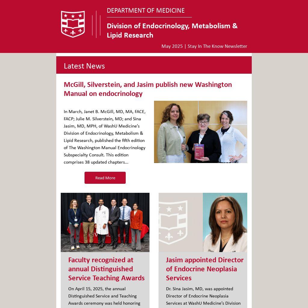 In March, Janet B. McGill, MD, MA, FACE, FACP; Julie M. Silverstein, MD; and Sina Jasim, MD, MPH, of WashU Medicine’s Division of Endocrinology, Metabolism & Lipid Research, published the fifth edition of The Washington Manual Endocrinology Subspecialty Consult. This edition comprises 38 updated chapters...