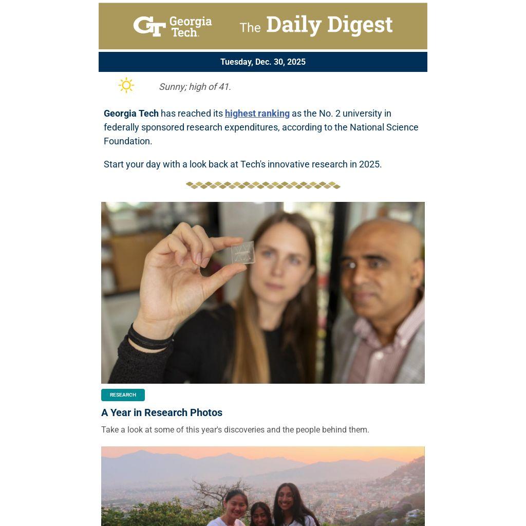 Georgia Tech has reached its highest ranking as the No. 2 university in federally sponsored research expenditures, according to the National Science Foundation.