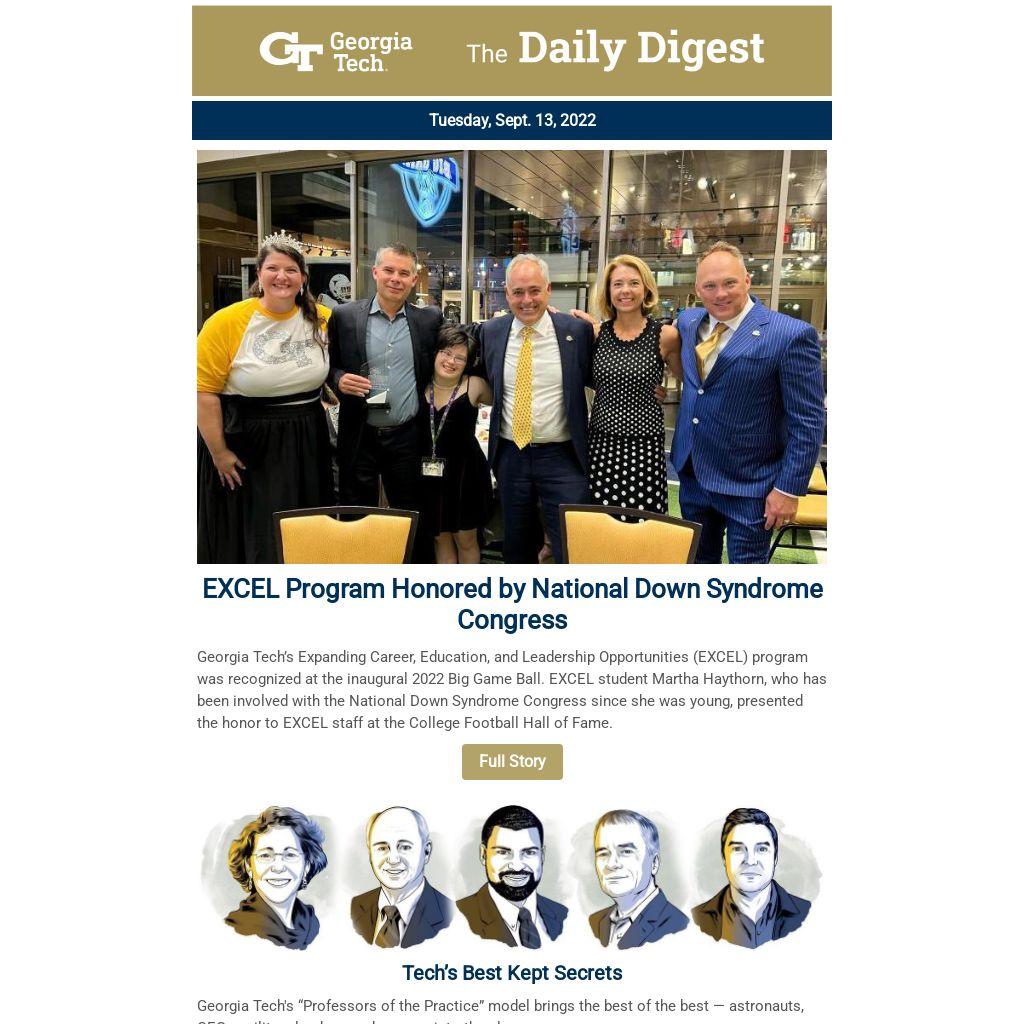 Georgia Tech’s Expanding Career, Education, and Leadership Opportunities (EXCEL) program was recognized at the inaugural 2022 Big Game Ball. EXCEL student Martha Haythorn, who has been involved with the National Down Syndrome Congress since she was young, presented the honor to EXCEL staff at the College Football Hall of Fame.