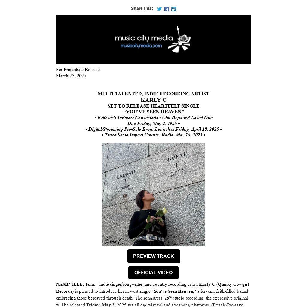 NASHVILLE, Tenn. - Indie singer/songwriter, and country recording artist, Karly C (Quirky Cowgirl Records) is pleased to introduce her newest single "You've Seen Heaven," a fervent, faith-filled ballad embracing those bereaved through death. The songstress' 29th studio recording, the expressive original will be released Friday, May 2, 2025 via all digital retail and streaming platforms. (Presale/Pre-save Event begins April 18, 2025.)