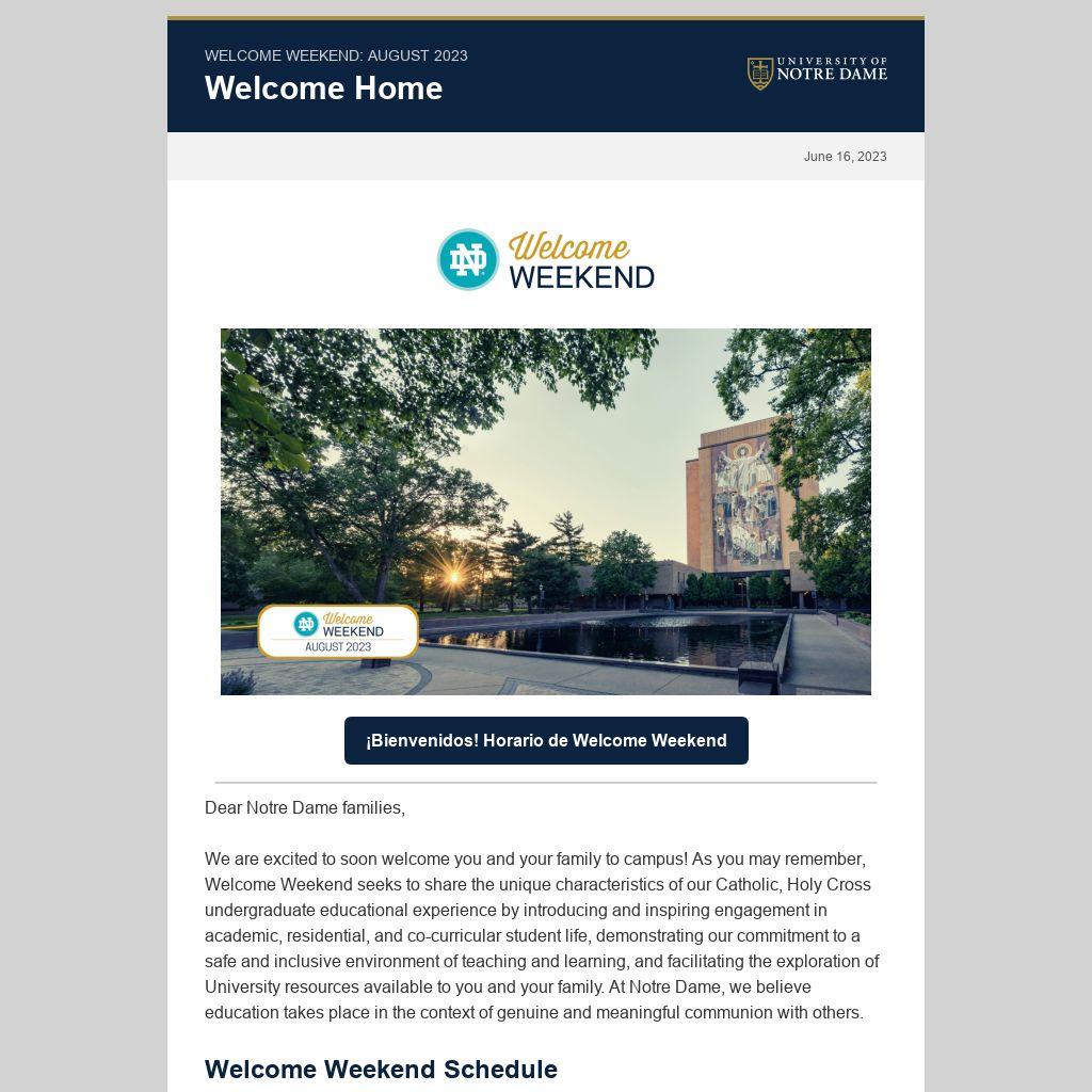 We are excited to soon welcome you and your family to campus! As you may remember, Welcome Weekend seeks to share the unique characteristics of our Catholic, Holy Cross undergraduate educational experience by introducing and inspiring engagement in academic, residential, and co-curricular student life, demonstrating our commitment to a safe and inclusive environment of teaching and learning, and facilitating the exploration of University resources available to you and your family. At Notre Dame, we believe education takes place in the context of genuine and meaningful communion with others.