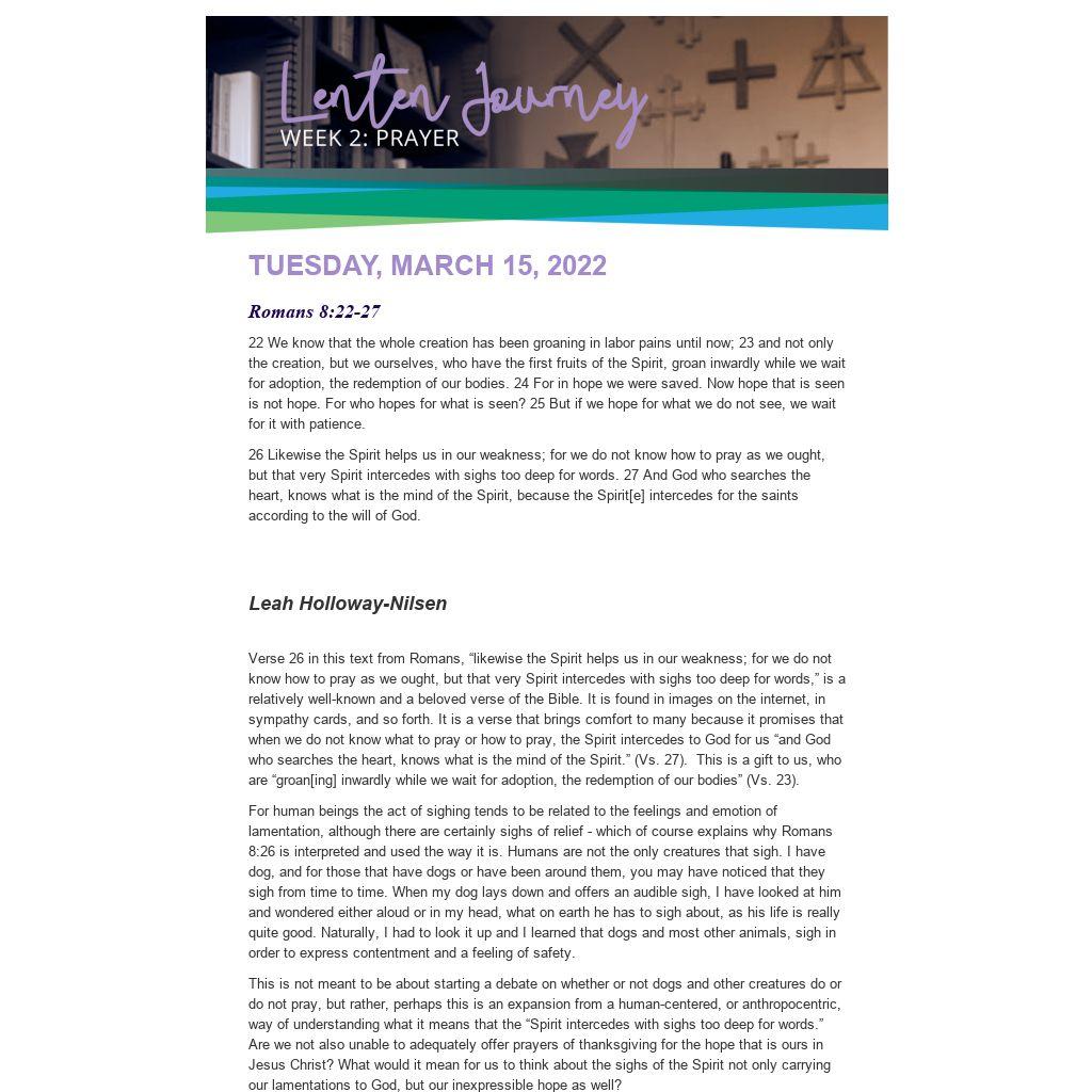 This is not meant to be about starting a debate on whether or not dogs and other creatures do or do not pray, but rather, perhaps this is an expansion from a human-centered, or anthropocentric, way of understanding what it means that the “Spirit intercedes with sighs too deep for words.” Are we not also unable to adequately offer prayers of thanksgiving for the hope that is ours in Jesus Christ? What would it mean for us to think about the sighs of the Spirit not only carrying our lamentations to God, but our inexpressible hope as well?