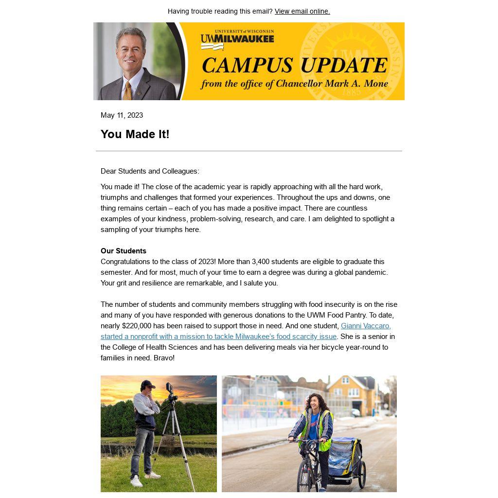The number of students and community members struggling with food insecurity is on the rise and many of you have responded with generous donations to the UWM Food Pantry. To date, nearly $220,000 has been raised to support those in need. And one student, Gianni Vaccaro, started a nonprofit with a mission to tackle Milwaukee’s food scarcity issue. She is a senior in the College of Health Sciences and has been delivering meals via her bicycle year-round to families in need. Bravo!