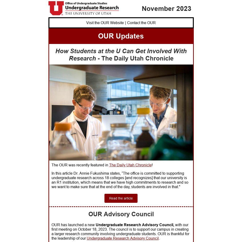 OUR has launched a new Undergraduate Research Advisory Council, with our first meeting on October 18, 2023. The council is to support our campus in creating a larger research community involving undergraduate students. OUR is thankful for the leadership of our Undergraduate Research Advisory Council.