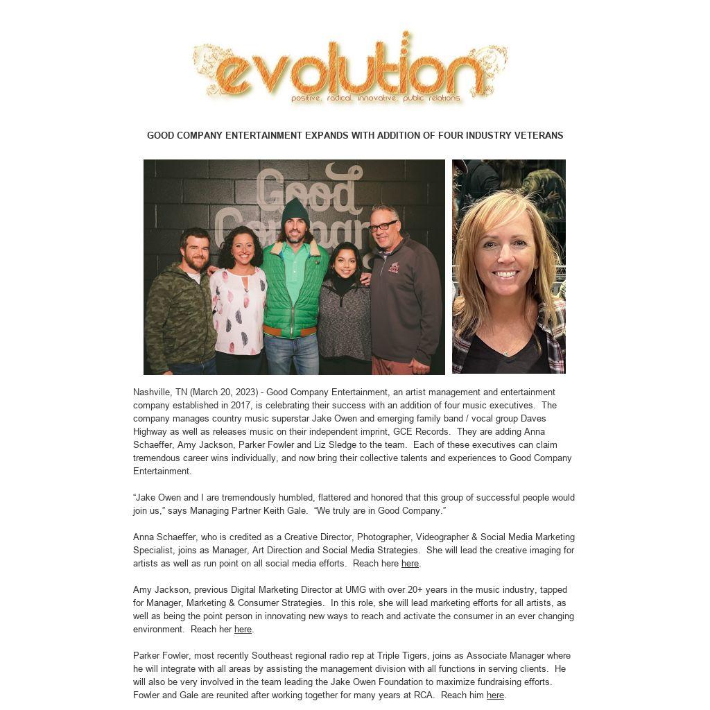 Nashville, TN (March 20, 2023) - Good Company Entertainment, an artist management and entertainment company established in 2017, is celebrating their success with an addition of four music executives. The company manages country music superstar Jake Owen and emerging family band / vocal group Daves Highway as well as releases music on their independent imprint, GCE Records. They are adding Anna Schaeffer, Amy Jackson, Parker Fowler and Liz Sledge to the team. Each of these executives can claim tremendous career wins individually, and now bring their collective talents and experiences to Good Company Entertainment.