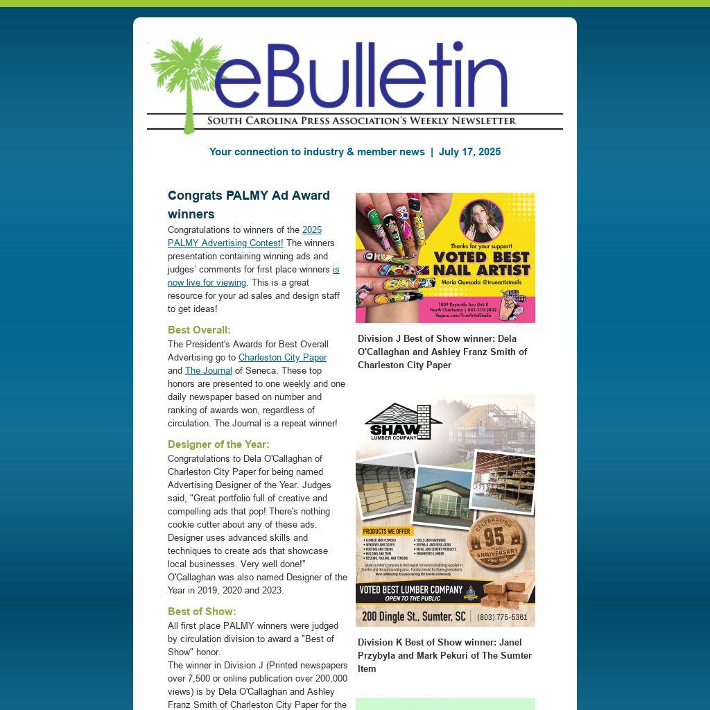 Congratulations to winners of the 2025 PALMY Advertising Contest! The winners presentation containing winning ads and judges’ comments for first place winners is now live for viewing. This is a great resource for your ad sales and design staff to get ideas!