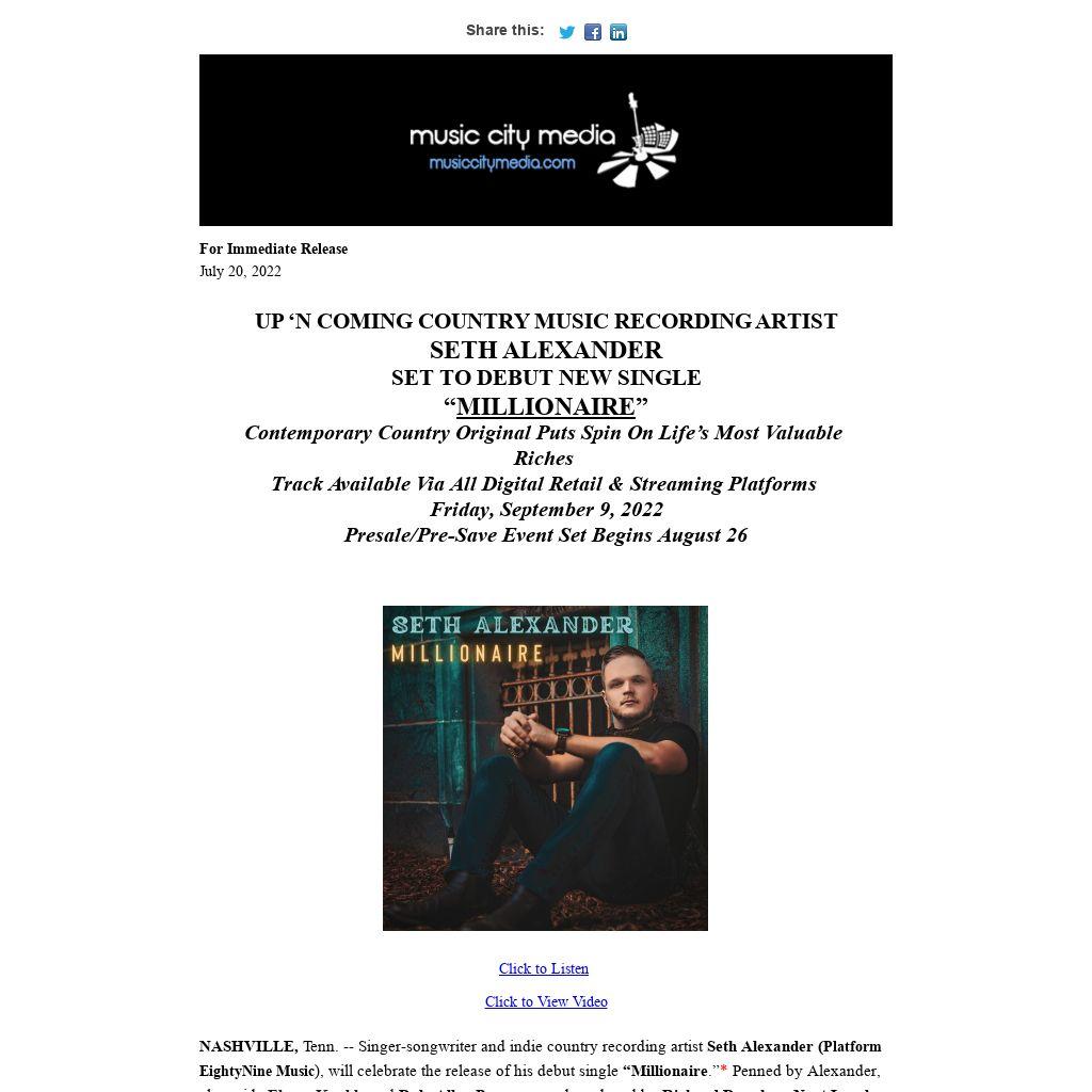 NASHVILLE, Tenn. -- Singer-songwriter and indie country recording artist Seth Alexander (Platform EightyNine Music), will celebrate the release of his debut single “Millionaire.”* Penned by Alexander, alongside Elmer Knable and Dale Allen Pommer, and produced by Richard Donahue, Next Level Entertainment (Nashville, TN), the track will be available via all digital retail outlets and streaming services on Friday, September 9, 2022. The presale/pre-save event begins Friday, August 26, 2022. (Digital retail and streaming services provided by Ed Gertler/Digital Retail Services).