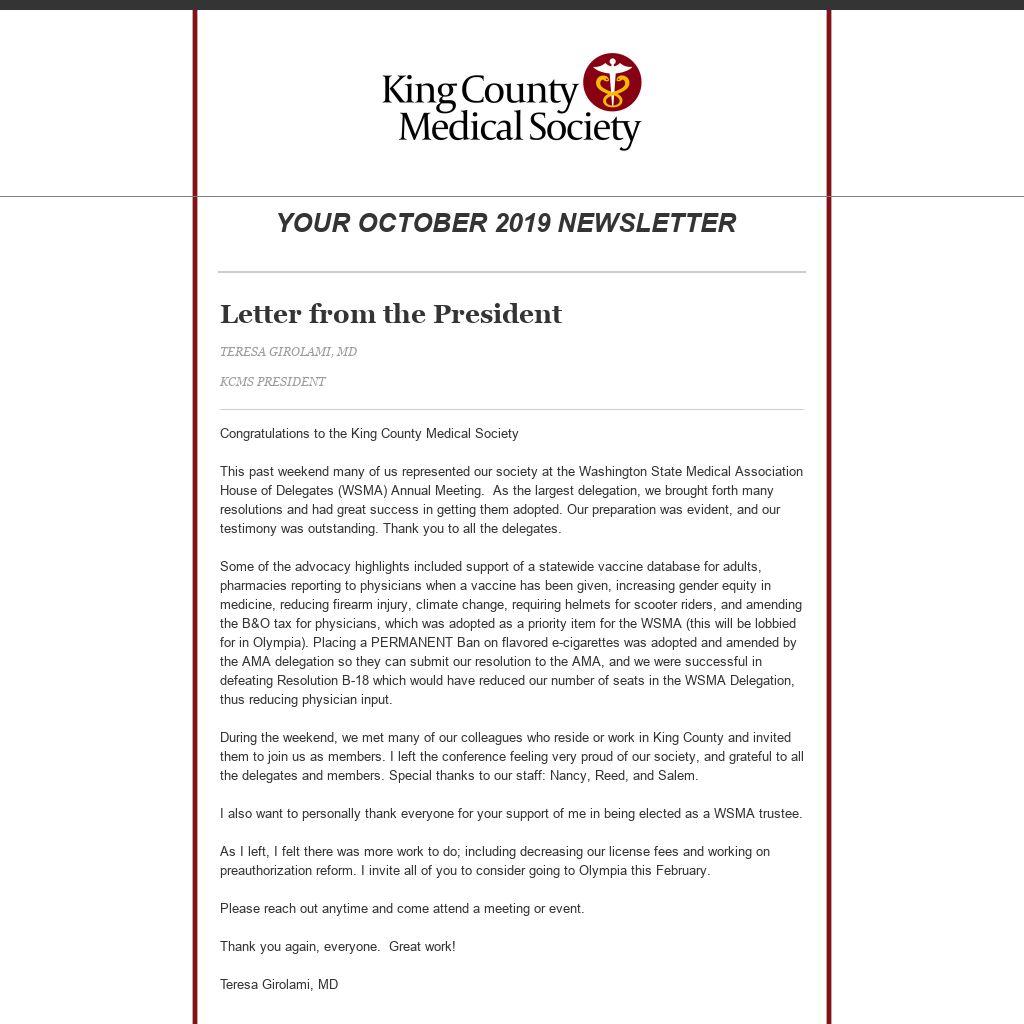 We just got back from a busy weekend at the WSMA Annual Meeting. I was told that our number of delegates was an all-time high. THANK YOU to you all for your dedication and hard work on behalf of all physicians in King County and across the state.
