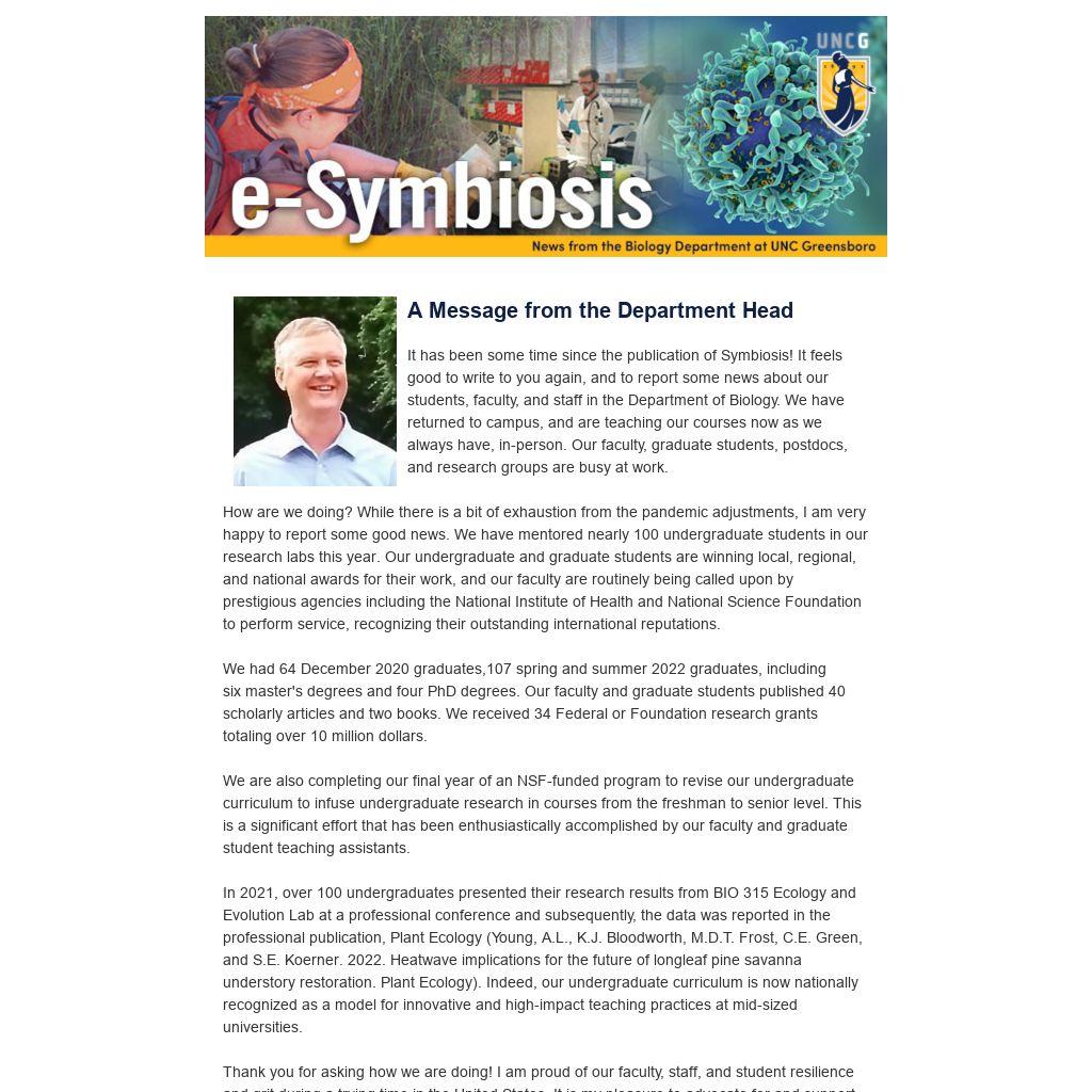 It has been some time since the publication of Symbiosis! It feels good to write to you again, and to report some news about our students, faculty, and staff in the Department of Biology. We have returned to campus, and are teaching our courses now as we always have, in-person. Our faculty, graduate students, postdocs, and research groups are busy at work.