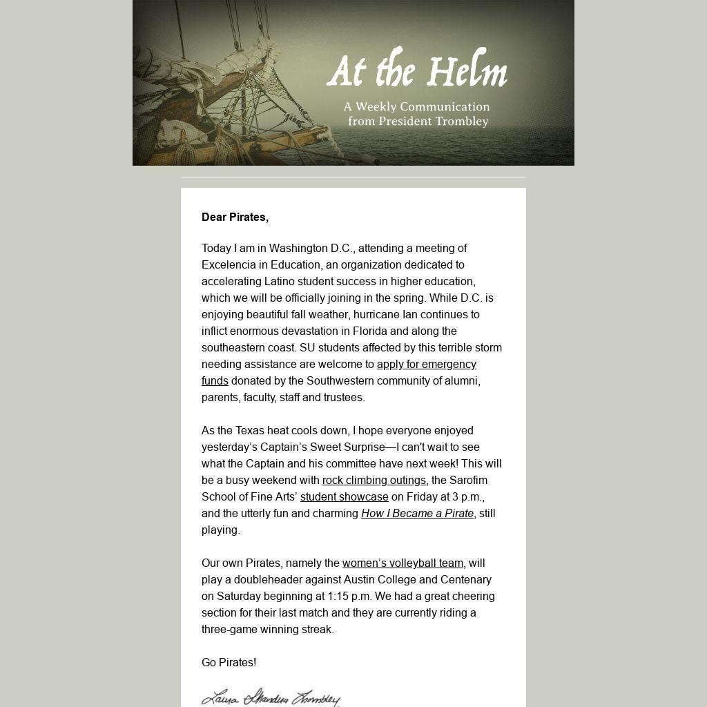 Today I am in Washington D.C., attending a meeting of Excelencia in Education, an organization dedicated to accelerating Latino student success in higher education, which we will be officially joining in the spring. While D.C. is enjoying beautiful fall weather, hurricane Ian continues to inflict enormous devastation in Florida and along the southeastern coast. SU students affected by this terrible storm needing assistance are welcome to apply for emergency funds donated by the Southwestern community of alumni, parents, faculty, staff and trustees.