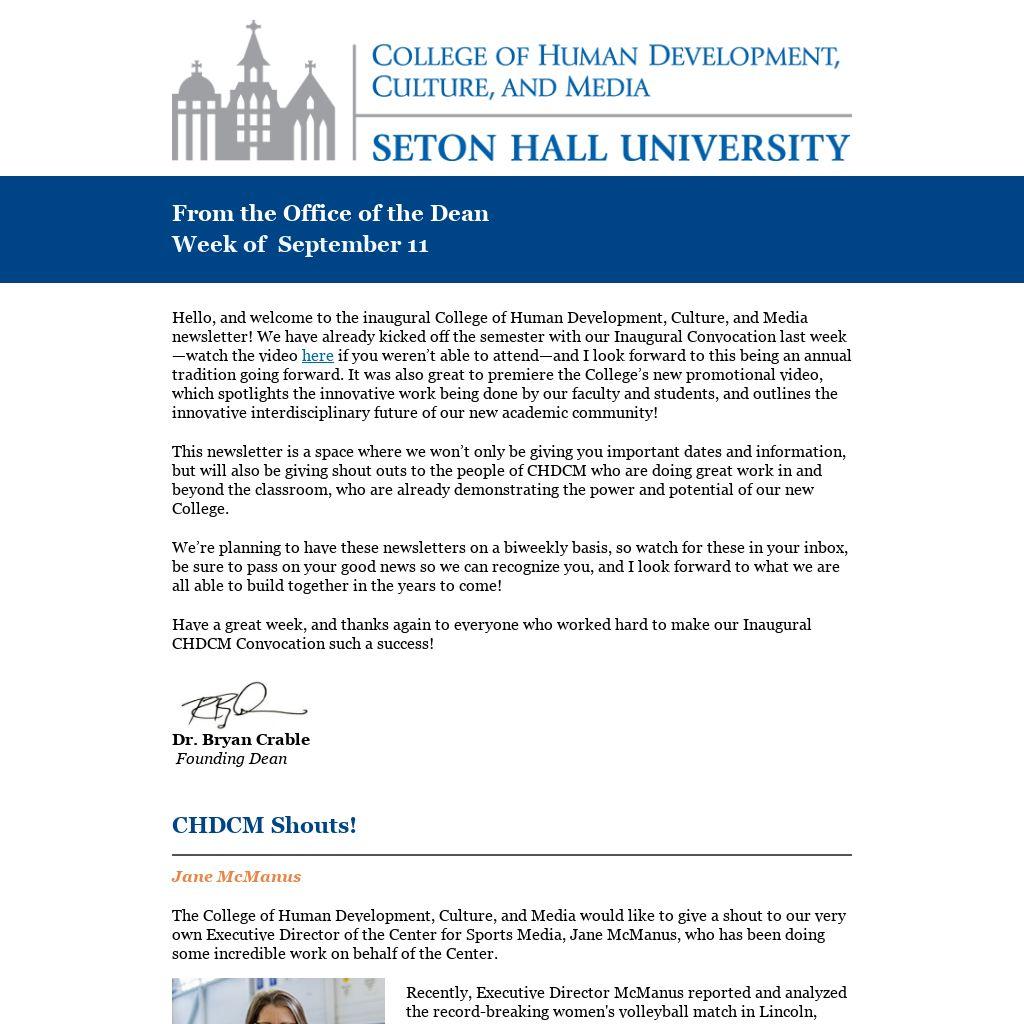 Hello, and welcome to the inaugural College of Human Development, Culture, and Media newsletter! We have already kicked off the semester with our Inaugural Convocation last week—watch the video here if you weren’t able to attend—and I look forward to this being an annual tradition going forward. It was also great to premiere the College’s new promotional video, which spotlights the innovative work being done by our faculty and students, and outlines the innovative interdisciplinary future of our new academic community!