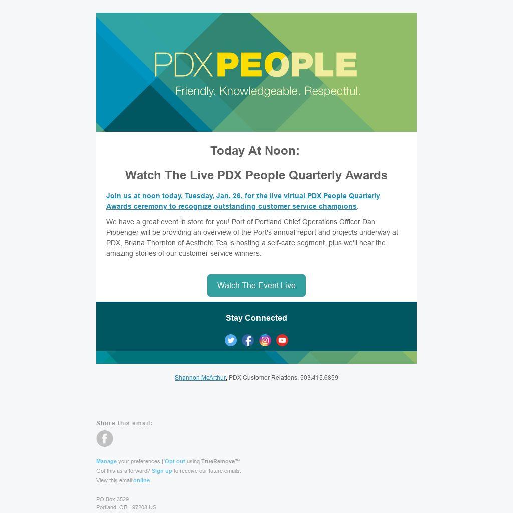 We have a great event in store for you! Port of Portland Chief Operations Officer Dan Pippenger will be providing an overview of the Port's annual report and projects underway at PDX, Briana Thornton of Aesthete Tea is hosting a self-care segment, plus we'll hear the amazing stories of our customer service winners.