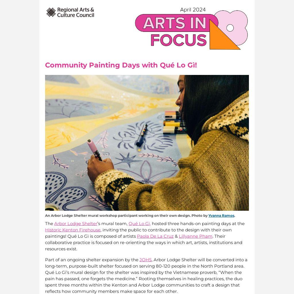 RACC and the City of Portland Parks & Recreation invite artists from Oregon and southern Washington to create a 2D artwork for the Mt. Scott Community Center's lobby! Community engagement is a central component of this project and we are seeking an artist or artist team who welcomes and reflects the diverse communities that are served by the center. The $80,000 budget for the commission comes from the City of Portland’s Percent for Art Program. Submissions are due by April 24, 2024. Find more details and apply here! A recorded info session is also available here.