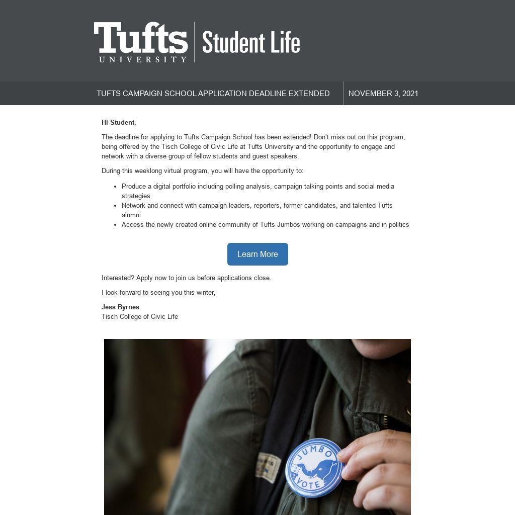 The deadline for applying to Tufts Campaign School has been extended! Don’t miss out on this program, being offered by the Tisch College of Civic Life at Tufts University and the opportunity to engage and network with a diverse group of fellow students and guest speakers.