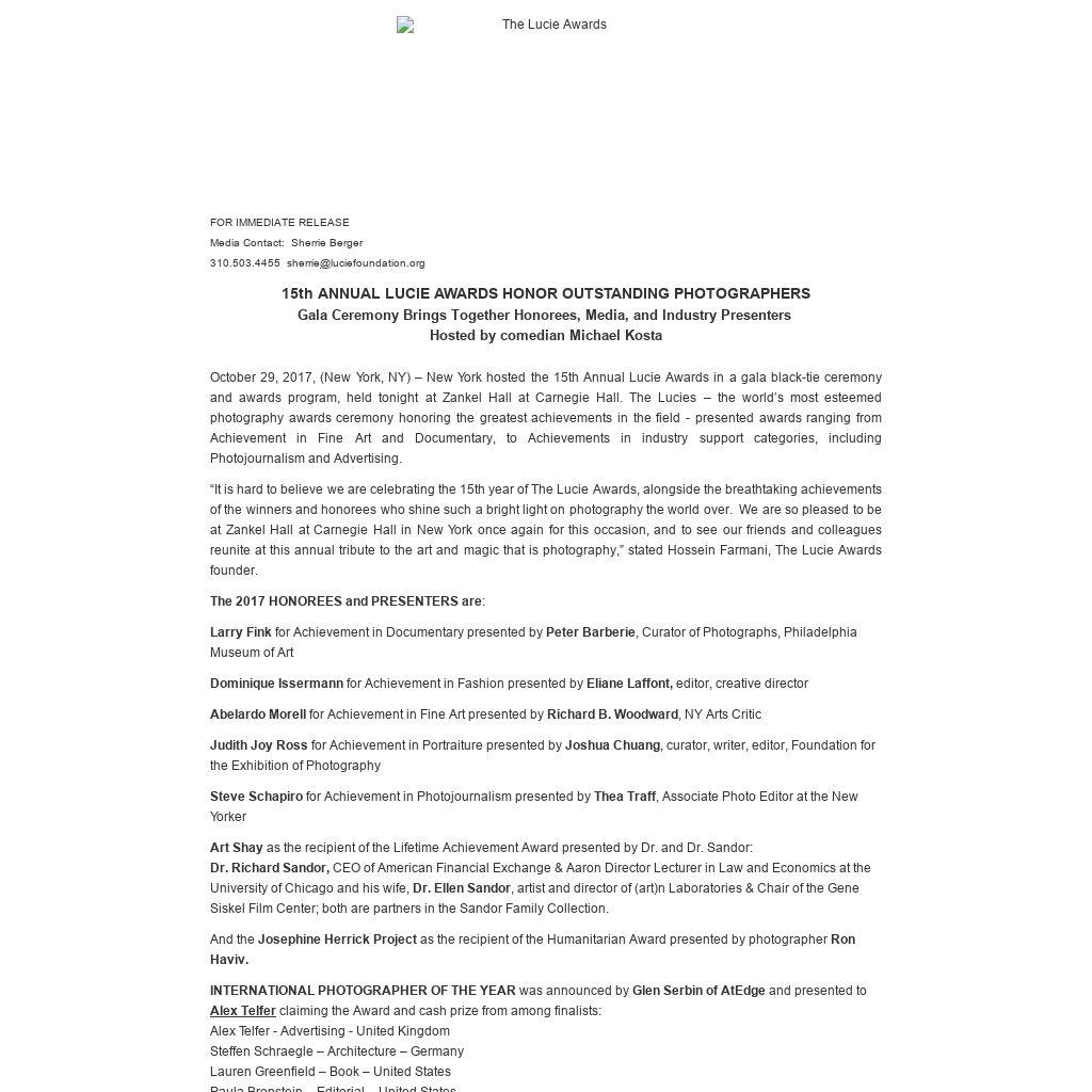 October 29, 2017, (New York, NY) – New York hosted the 15th Annual Lucie Awards in a gala black-tie ceremony and awards program, held tonight at Zankel Hall at Carnegie Hall. The Lucies – the world’s most esteemed photography awards ceremony honoring the greatest achievements in the field - presented awards ranging from Achievement in Fine Art and Documentary, to Achievements in industry support categories, including Photojournalism and Advertising.