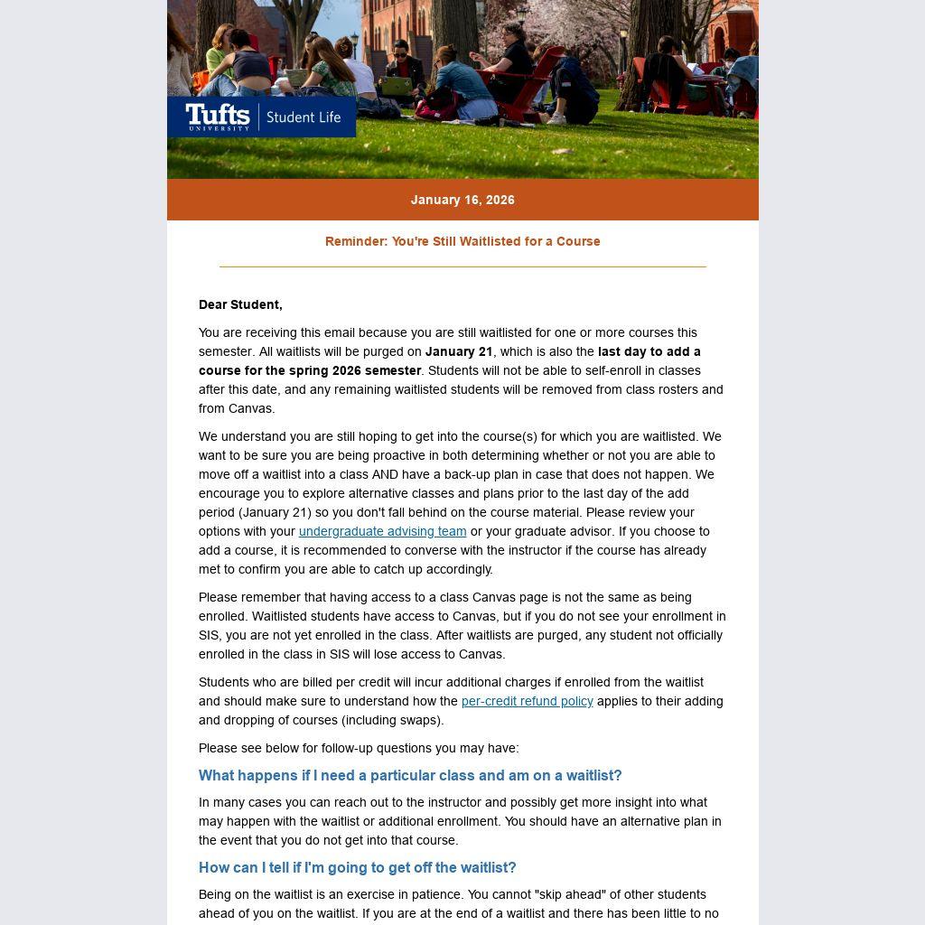 You are receiving this email because you are still waitlisted for one or more courses this semester. All waitlists will be purged on January 21, which is also the last day to add a course for the spring 2026 semester. Students will not be able to self-enroll in classes after this date, and any remaining waitlisted students will be removed from class rosters and from Canvas.