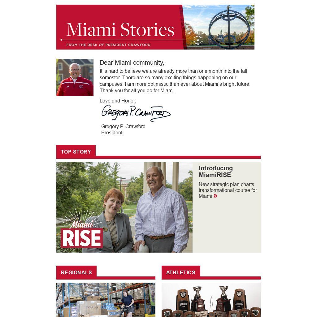 It is hard to believe we are already more than one month into the fall semester. There are so many exciting things happening on our campuses. I am more optimistic than ever about Miami’s bright future. Thank you for all you do for Miami.