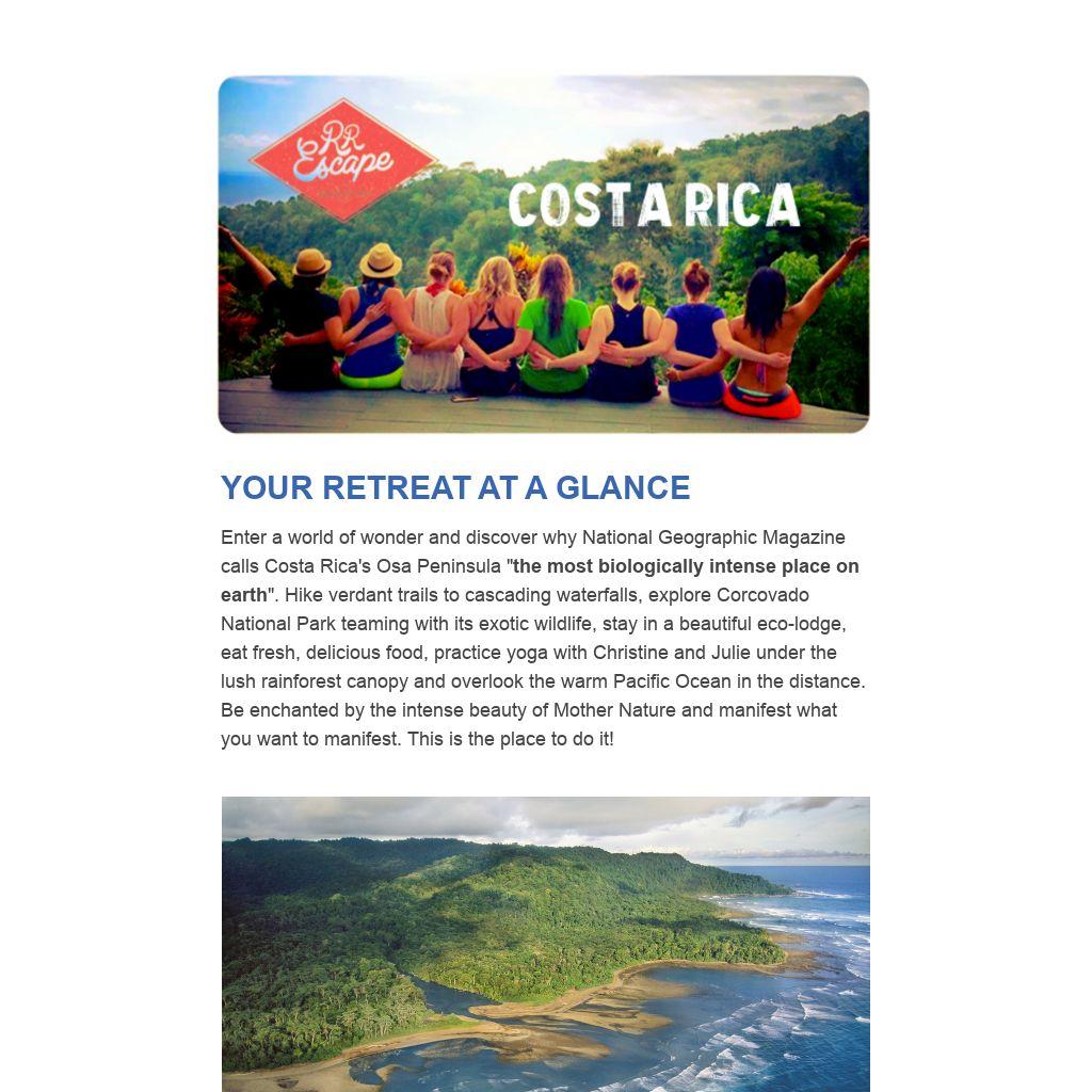 Enter a world of wonder and discover why National Geographic Magazine calls Costa Rica's Osa Peninsula "the most biologically intense place on earth". Hike verdant trails to cascading waterfalls, explore Corcovado National Park teaming with its exotic wildlife, stay in a beautiful eco-lodge, eat fresh, delicious food, practice yoga with Christine and Julie under the lush rainforest canopy and overlook the warm Pacific Ocean in the distance. Be enchanted by the intense beauty of Mother Nature and manifest what you want to manifest. This is the place to do it!