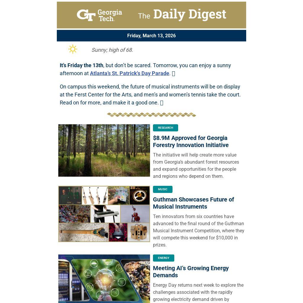 On campus this weekend, the future of musical instruments will be on display at the Ferst Center for the Arts, and men’s and women’s tennis take the court. Read on for more, and make it a good one. 🐝