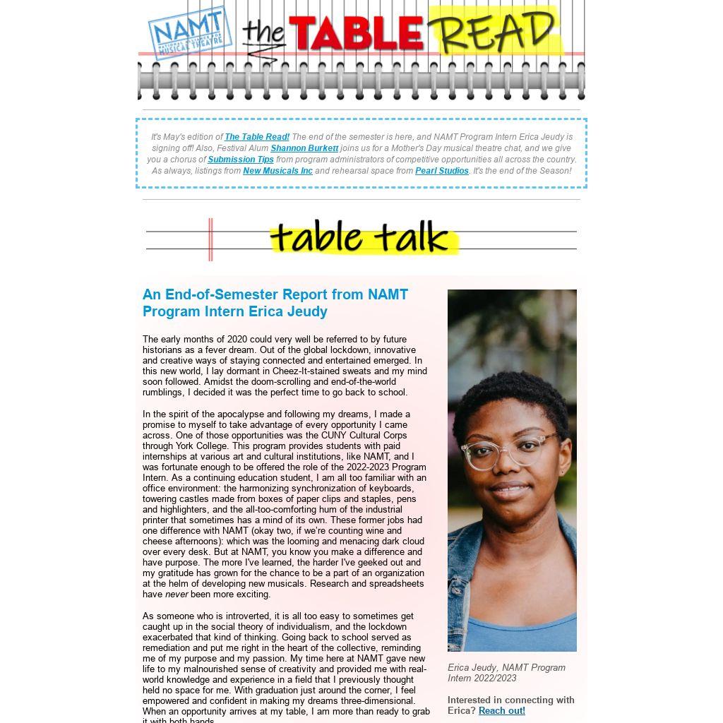 It's May's edition of The Table Read! The end of the semester is here, and NAMT Program Intern Erica Jeudy is signing off! Also, Festival Alum Shannon Burkett joins us for a Mother's Day musical theatre chat, and we give you a chorus of Submission Tips from program administrators of competitive opportunities all across the country. As always, listings from New Musicals Inc and rehearsal space from Pearl Studios. It's the end of the Season!