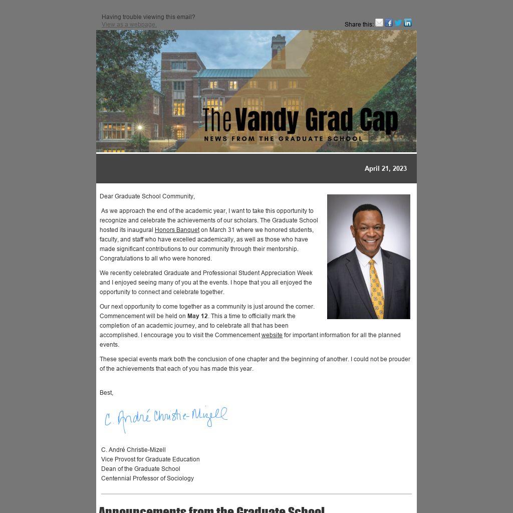 Newsletter SubmissionsTo submit content for this newsletter or to subscribe, please email all relevant information to gradschoolnews@vanderbilt.edu by the 10th day of each month. The newsletter will be published around middle of each month.