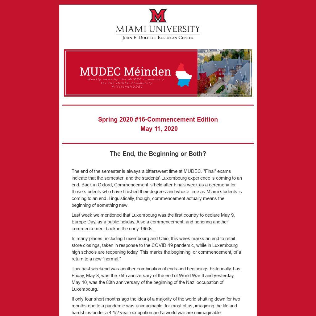 The end of the semester is always a bittersweet time at MUDEC. "Final" exams indicate that the semester, and the students' Luxembourg experience is coming to an end. Back in Oxford, Commencement is held after Finals week as a ceremony for those students who have finished their degrees and whose time as Miami students is coming to an end. Linguistically, though, commencement actually means the beginning of something new.