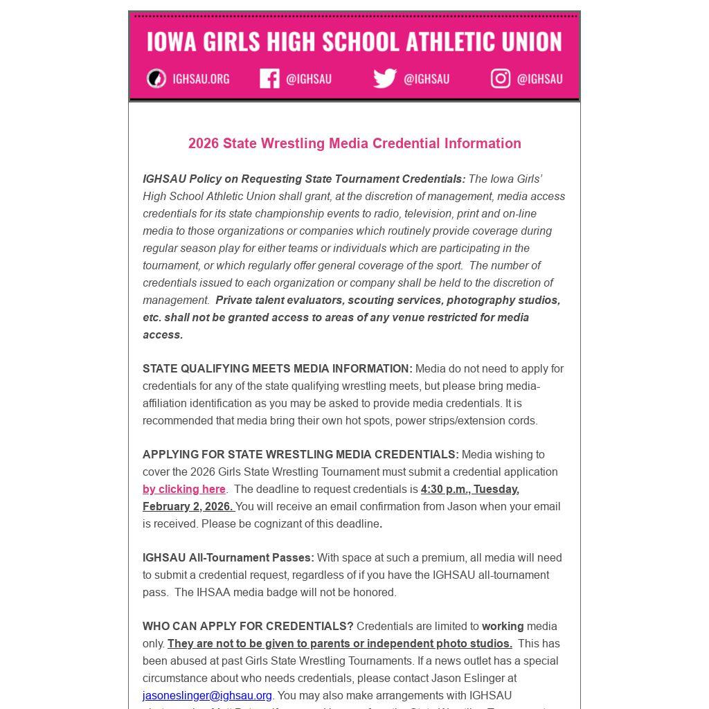 APPLYING FOR STATE WRESTLING MEDIA CREDENTIALS: Media wishing to cover the 2026 Girls State Wrestling Tournament must submit a credential application by clicking here. The deadline to request credentials is 4:30 p.m., Tuesday, February 2, 2026. You will receive an email confirmation from Jason when your email is received. Please be cognizant of this deadline.