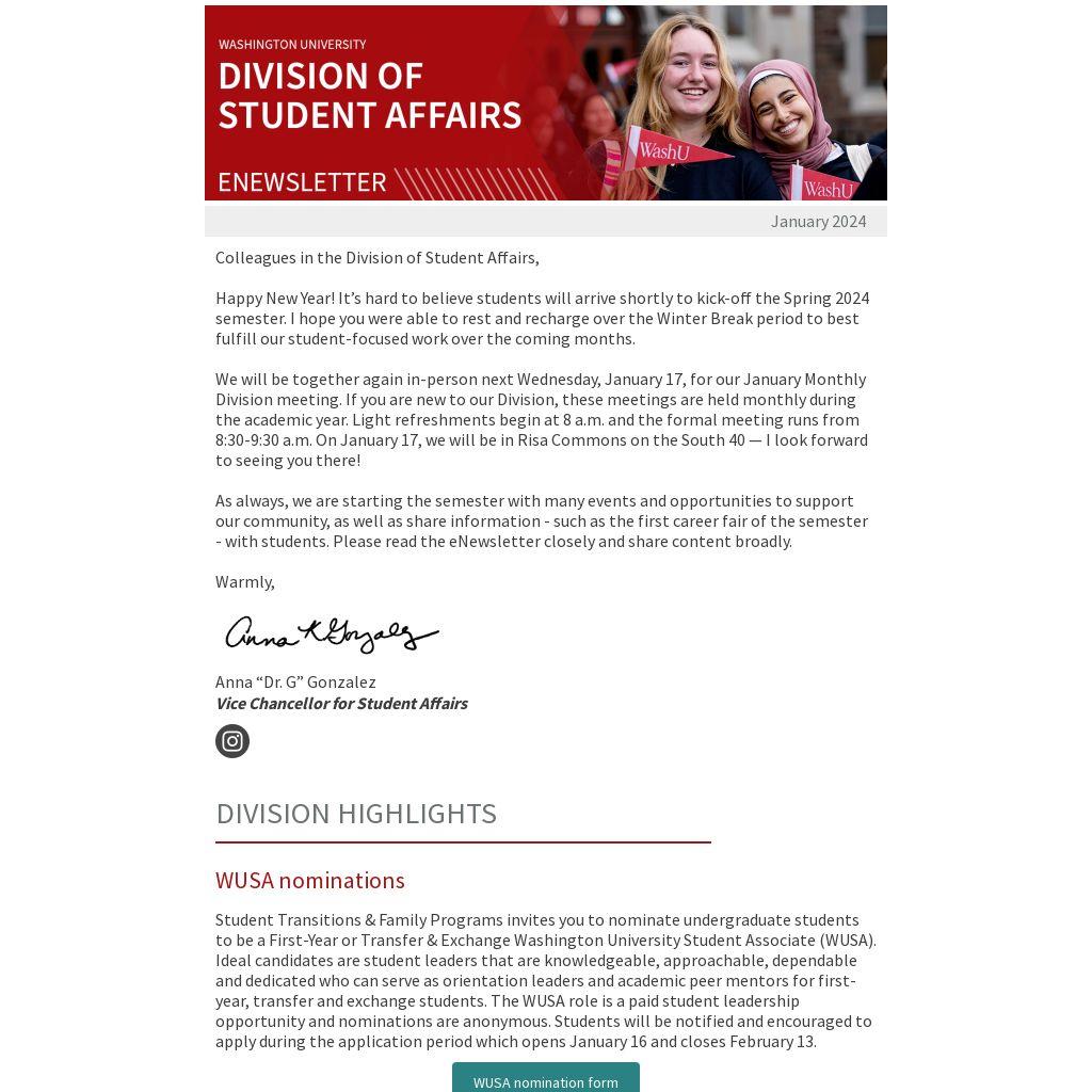 Student Transitions & Family Programs invites you to nominate undergraduate students to be a First-Year or Transfer & Exchange Washington University Student Associate (WUSA). Ideal candidates are student leaders that are knowledgeable, approachable, dependable and dedicated who can serve as orientation leaders and academic peer mentors for first-year, transfer and exchange students. The WUSA role is a paid student leadership opportunity and nominations are anonymous. Students will be notified and encouraged to apply during the application period which opens January 16 and closes February 13.