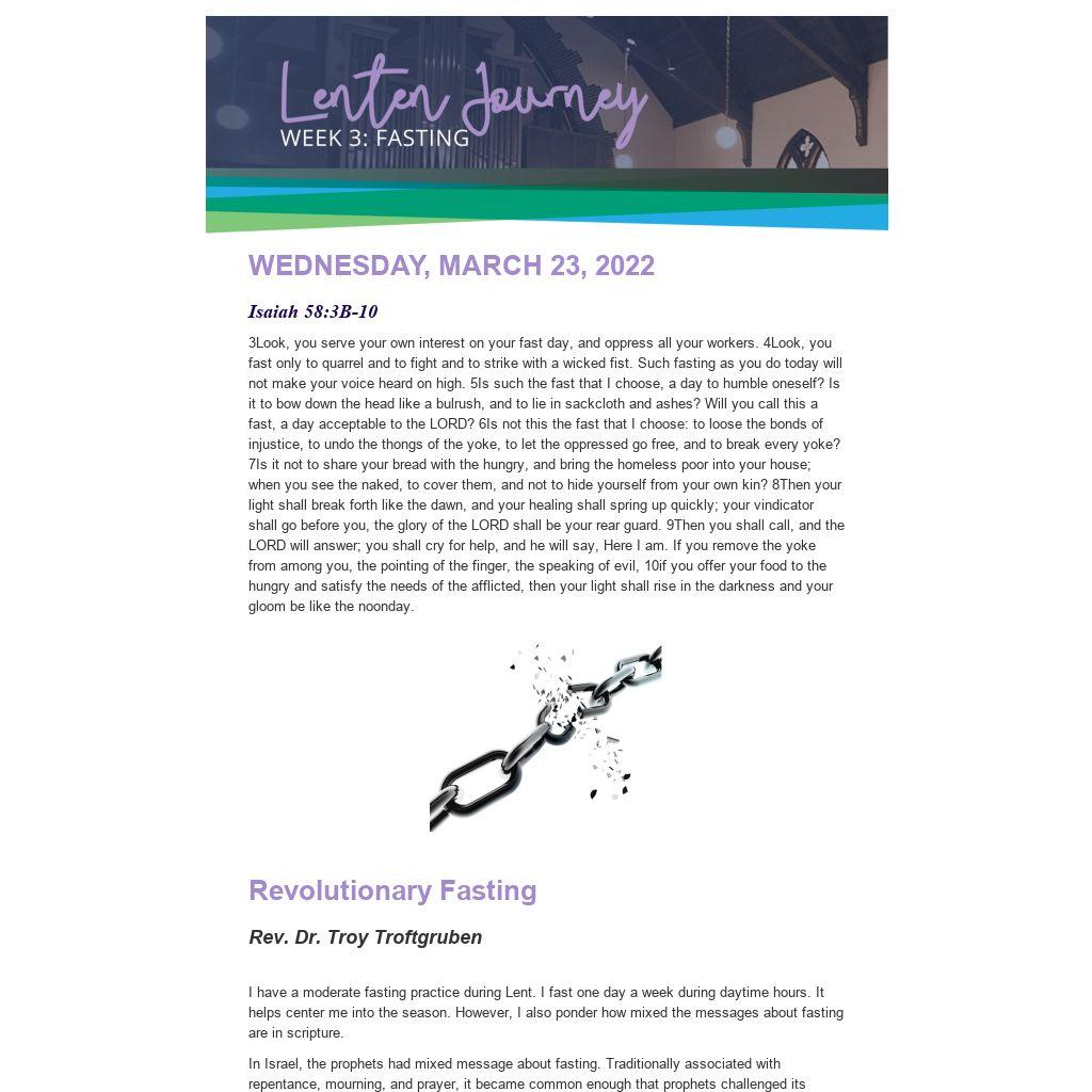 This Lenten season, I’m still doing some fasting (from food). But I’m also pondering how to fast from war and violence (to honor Ukrainian victims), how to fast from overindulgence (to honor those with food insecurity), and how to fast from unnecessary carbon use (to honor creation). I find myself considering more thoughtfully how our practices of restraint help us stand in greater solidarity with others by challenging injustice in Jesus’ name.