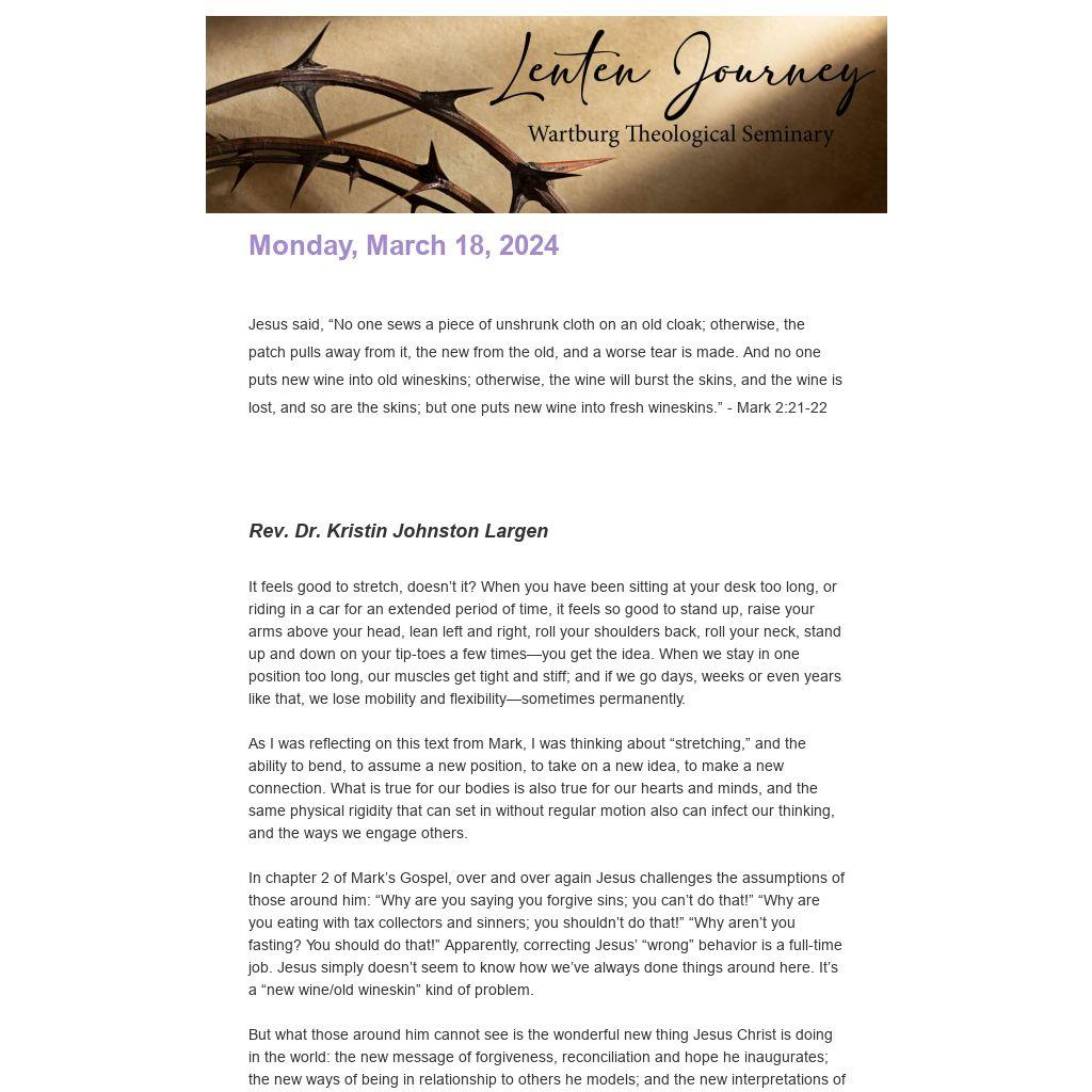 Like so many of Jesus’ parables, there is an invitation in here for us—an invitation to stretch. The life of discipleship is a life on the way, a life on the move, a life of stretching and growing, following the One whose name we bear. This Lenten season, what new thing is God inviting you to participate in; what new ways of seeing the world? Where is God inviting you to stretch?
