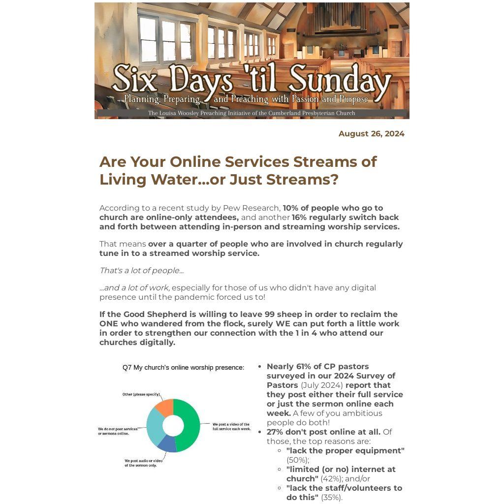 | - Nearly 61% of CP pastors surveyed in our 2024 Survey of Pastors (July 2024) report that they post either their full service or just the sermon online each week. A few of you ambitious people do both!