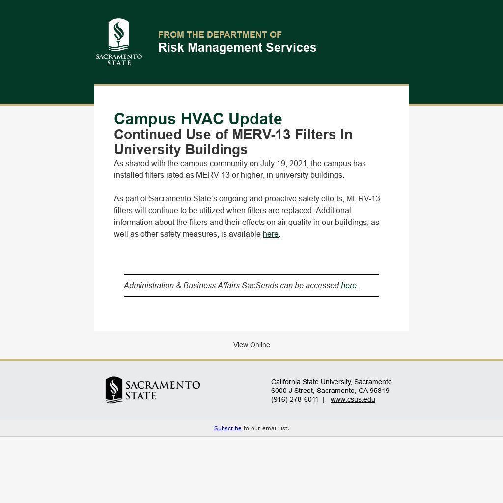 As part of Sacramento State’s ongoing and proactive safety efforts, MERV-13 filters will continue to be utilized when filters are replaced. Additional information about the filters and their effects on air quality in our buildings, as well as other safety measures, is available