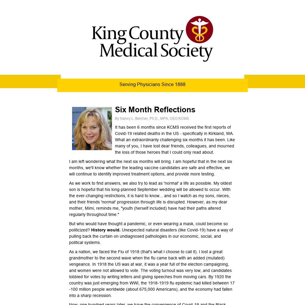 It has been 6 months since KCMS received the first reports of Covid-19 related deaths in the US - specifically in Kirkland, WA. What an extraordinarily challenging six months it has been. Like many of you, I have lost dear friends, colleagues, and mourned the loss of those heroes that I could only read about.