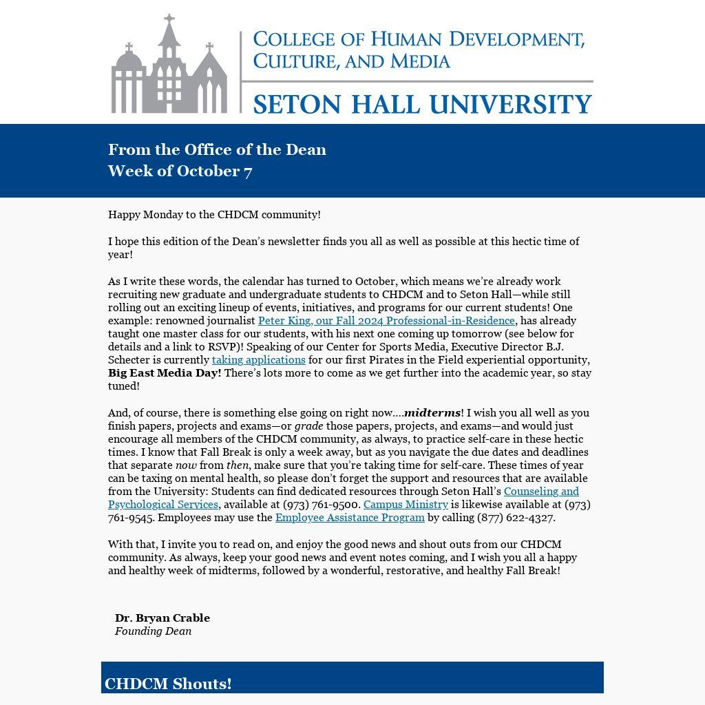 And, of course, there is something else going on right now….midterms! I wish you all well as you finish papers, projects and exams—or grade those papers, projects, and exams—and would just encourage all members of the CHDCM community, as always, to practice self-care in these hectic times. I know that Fall Break is only a week away, but as you navigate the due dates and deadlines that separate now from then, make sure that you’re taking time for self-care. These times of year can be taxing on mental health, so please don’t forget the support and resources that are available from the University: Students can find dedicated resources through Seton Hall’s Counseling and Psychological Services, available at (973) 761-9500. Campus Ministry is likewise available at (973) 761-9545. Employees may use the Employee Assistance Program by calling (877) 622-4327.