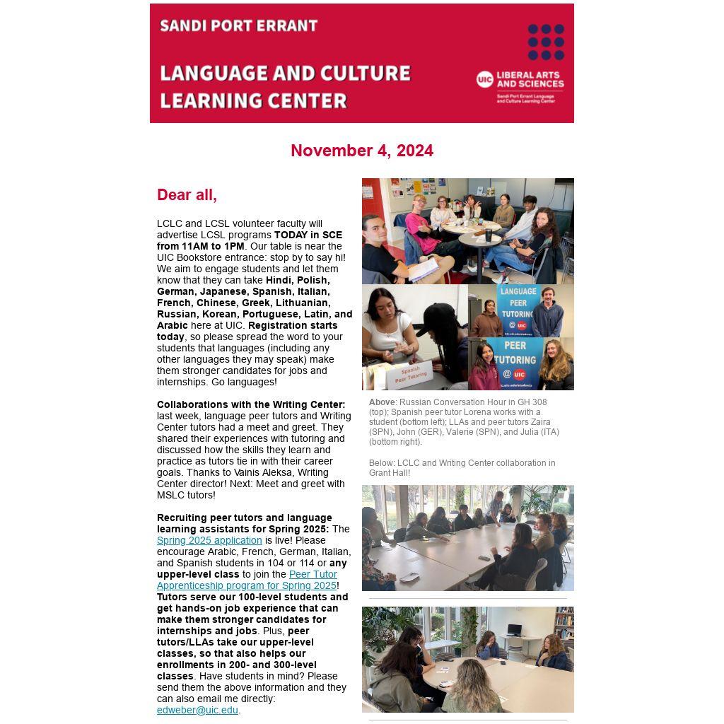 LCLC and LCSL volunteer faculty will advertise LCSL programs TODAY in SCE from 11AM to 1PM. Our table is near the UIC Bookstore entrance: stop by to say hi! We aim to engage students and let them know that they can take Hindi, Polish, German, Japanese, Spanish, Italian, French, Chinese, Greek, Lithuanian, Russian, Korean, Portuguese, Latin, and Arabic here at UIC. Registration starts today, so please spread the word to your students that languages (including any other languages they may speak) make them stronger candidates for jobs and internships. Go languages!