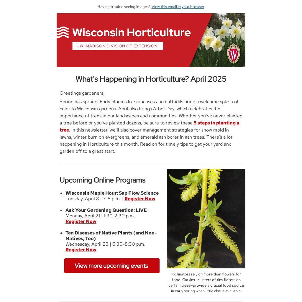 Spring has sprung! Early blooms like crocuses and daffodils bring a welcome splash of color to Wisconsin gardens. April also brings Arbor Day, which celebrates the importance of trees in our landscapes and communities. Whether you’ve never planted a tree before or you’ve planted dozens, be sure to review these 5 steps in planting a tree. In this newsletter, we’ll also cover management strategies for snow mold in lawns, winter burn on evergreens, and emerald ash borer in ash trees. There’s a lot happening in Horticulture this month. Read on for timely tips to get your yard and garden off to a great start.