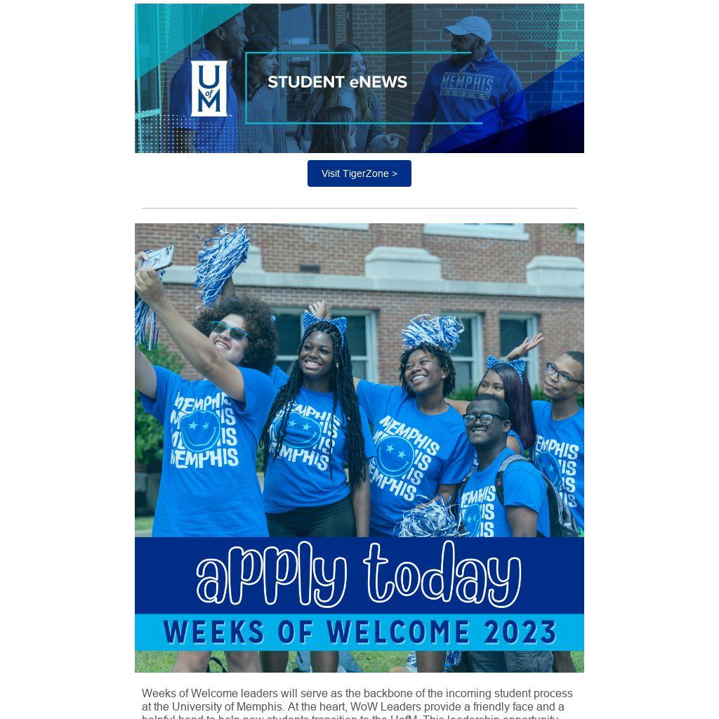 Weeks of Welcome leaders will serve as the backbone of the incoming student process at the University of Memphis. At the heart, WoW Leaders provide a friendly face and a helpful hand to help new students transition to the UofM. This leadership opportunity supports the mission of the University of Memphis and Student Leadership and Involvement to provide programmatic support to Weeks of Welcome in August. The primary role of a WoW Leader is to co-lead a small group of 15-25 incoming students during the Weeks of Welcome. WoW Leaders are expected to be present for all parts of WoW, engage in welcoming dialogue, and invest in the incoming students.