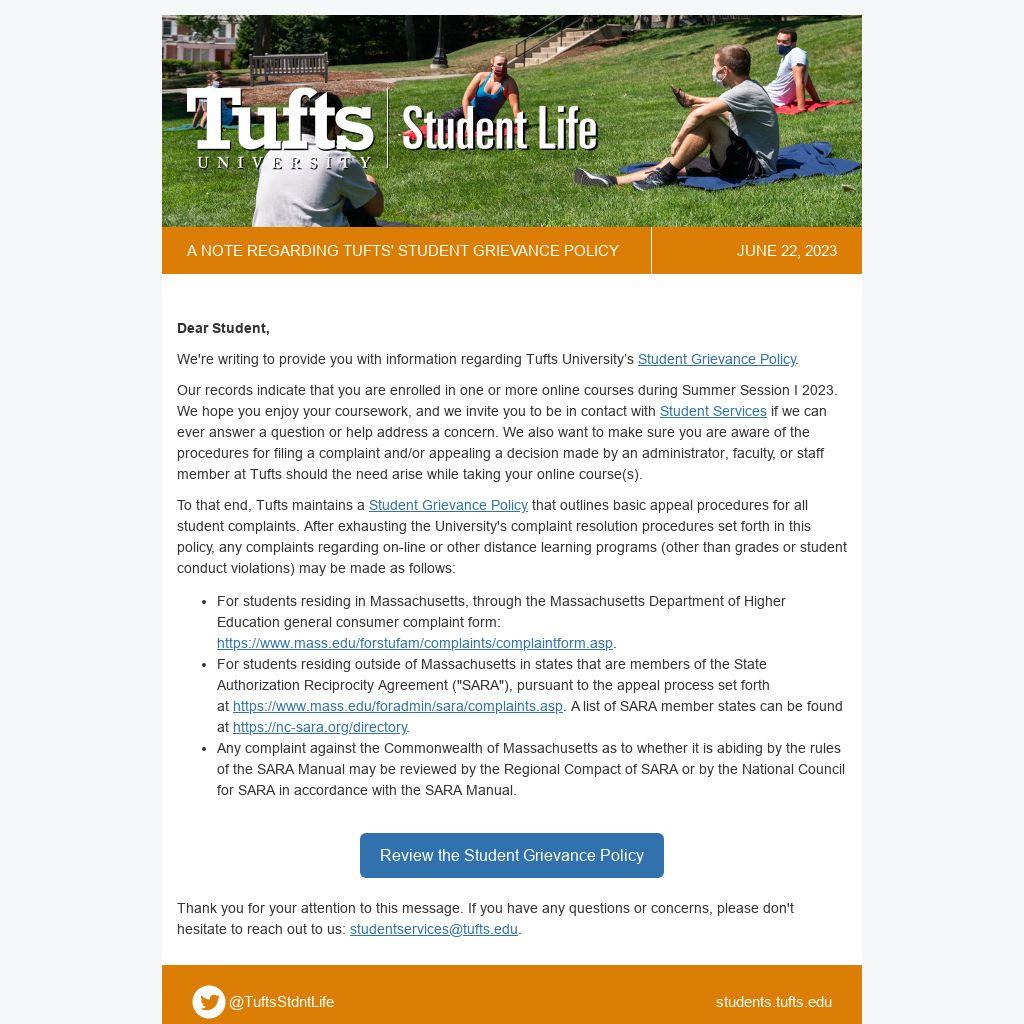 Our records indicate that you are enrolled in one or more online courses during Summer Session I 2023. We hope you enjoy your coursework, and we invite you to be in contact with Student Services if we can ever answer a question or help address a concern. We also want to make sure you are aware of the procedures for filing a complaint and/or appealing a decision made by an administrator, faculty, or staff member at Tufts should the need arise while taking your online course(s).