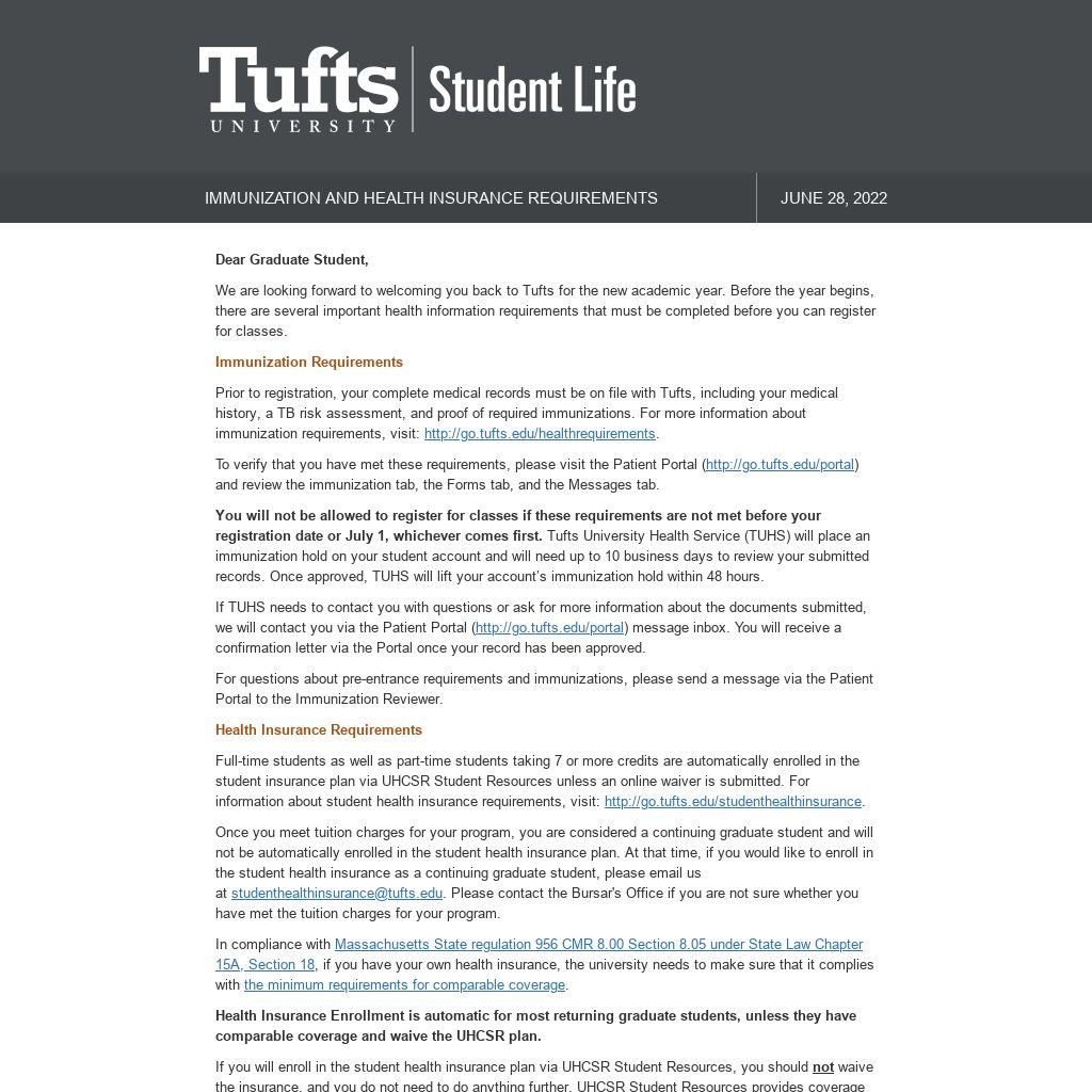 We are looking forward to welcoming you back to Tufts for the new academic year. Before the year begins, there are several important health information requirements that must be completed before you can register for classes.