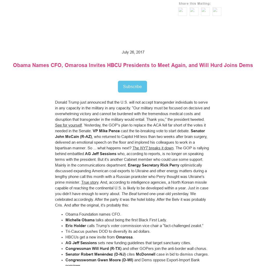 Donald Trump just announced that the U.S. will not accept transgender individuals to serve in any capacity in the military in any capacity. “Our military must be focused on decisive and overwhelming victory and cannot be burdened with the tremendous medical costs and disruption that transgender in the military would entail. Thank you,” the president tweeted. See for yourself. Yesterday, the GOP’s plan to replace the ACA fell far short of the votes it needed in the Senate. VP Mike Pence cast the tie-breaking vote to start debate. Senator John McCain (R-AZ), who returned to Capitol Hill less than two weeks after brain surgery, delivered an emotional speech on the floor and implored his colleagues to work in a bipartisan manner. So ... what happens next? The NYT breaks it down. The GOP is rallying behind embattled AG Jeff Sessions who, according to reports, is no longer on speaking terms with the president. But it’s another Cabinet member who could use some support. Mainly in the communications department. Energy Secretary Rick Perry optimistically discussed expanding American coal exports to Ukraine and other energy matters during a lengthy phone call this month with a Russian prankster who Perry thought was Ukraine's prime minister. True story. And, according to intelligence agencies, a North Korean missile capable of reaching the continental U.S. is likely to be developed within a year. Just in case you didn’t have enough to worry about. The Beat turned one-year-old yesterday. We celebrated accordingly. After the party it was the hotel lobby. After the Belv it was probably Cris. And after the original, it’s probably this: