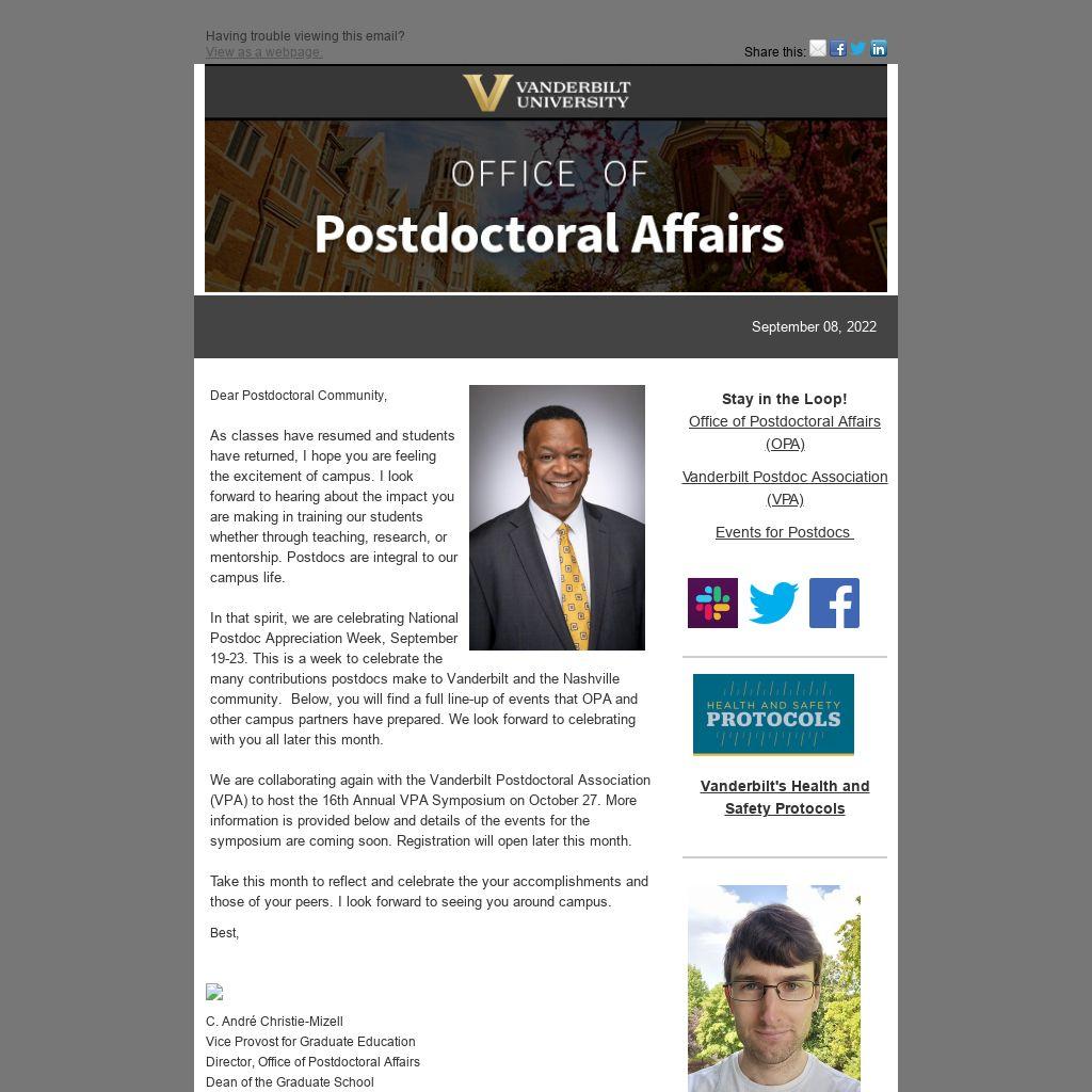 In that spirit, we are celebrating National Postdoc Appreciation Week, September 19-23. This is a week to celebrate the many contributions postdocs make to Vanderbilt and the Nashville community. Below, you will find a full line-up of events that OPA and other campus partners have prepared. We look forward to celebrating with you all later this month.