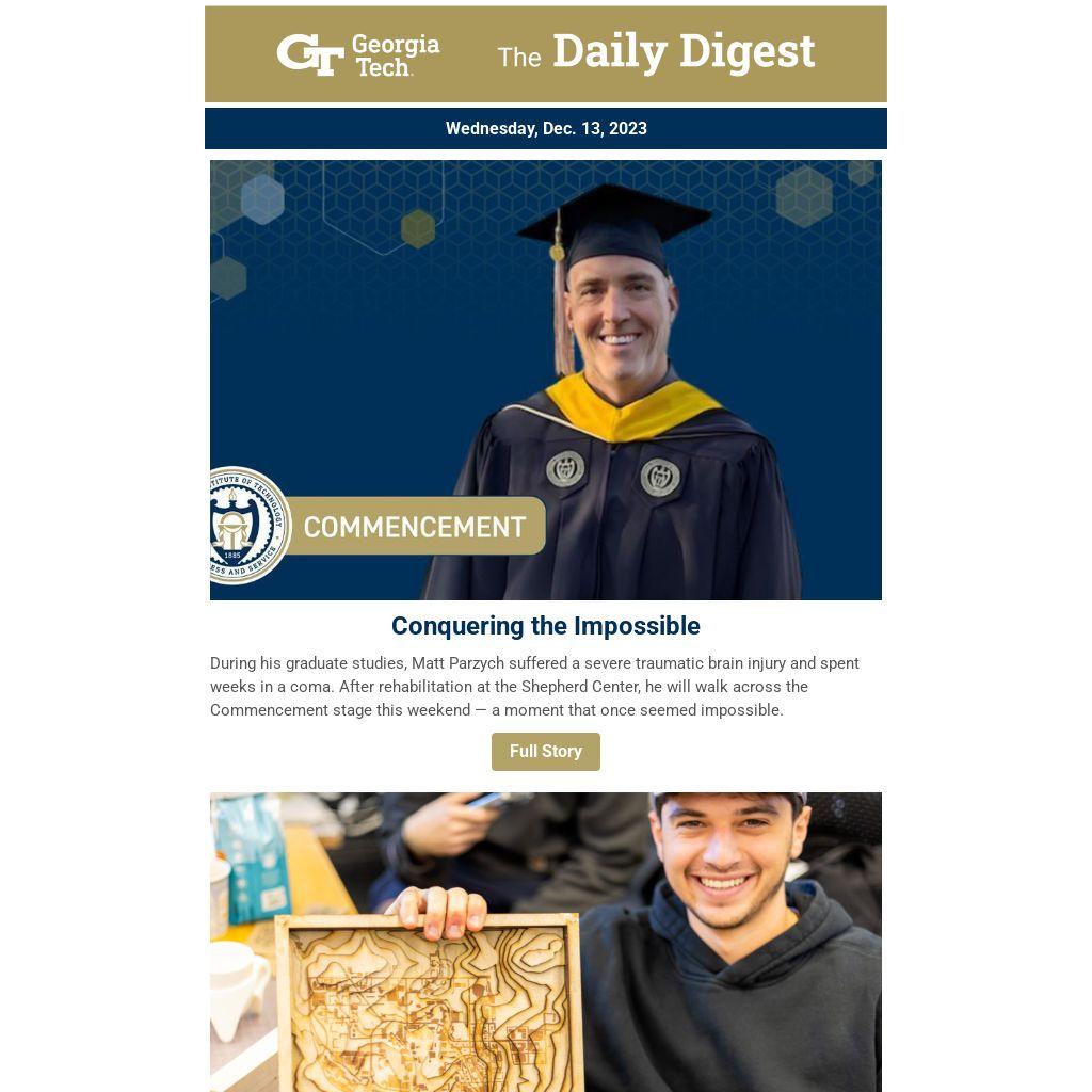 During his graduate studies, Matt Parzych suffered a severe traumatic brain injury and spent weeks in a coma. After rehabilitation at the Shepherd Center, he will walk across the Commencement stage this weekend — a moment that once seemed impossible.
