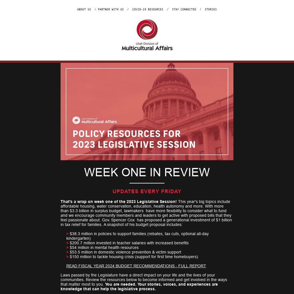 That's a wrap on week one of the 2023 Legislative Session! This year's big topics include affordable housing, water conservation, education, health autonomy and more. With more than $3.3 billion in surplus budget, lawmakers have more flexibility to consider what to fund and we encourage community members and leaders to get active with proposed bills that they feel passionate about. Gov. Spencer Cox has proposed a generational investment of $1 billion in tax relief for families. A snapshot of his budget proposal includes: